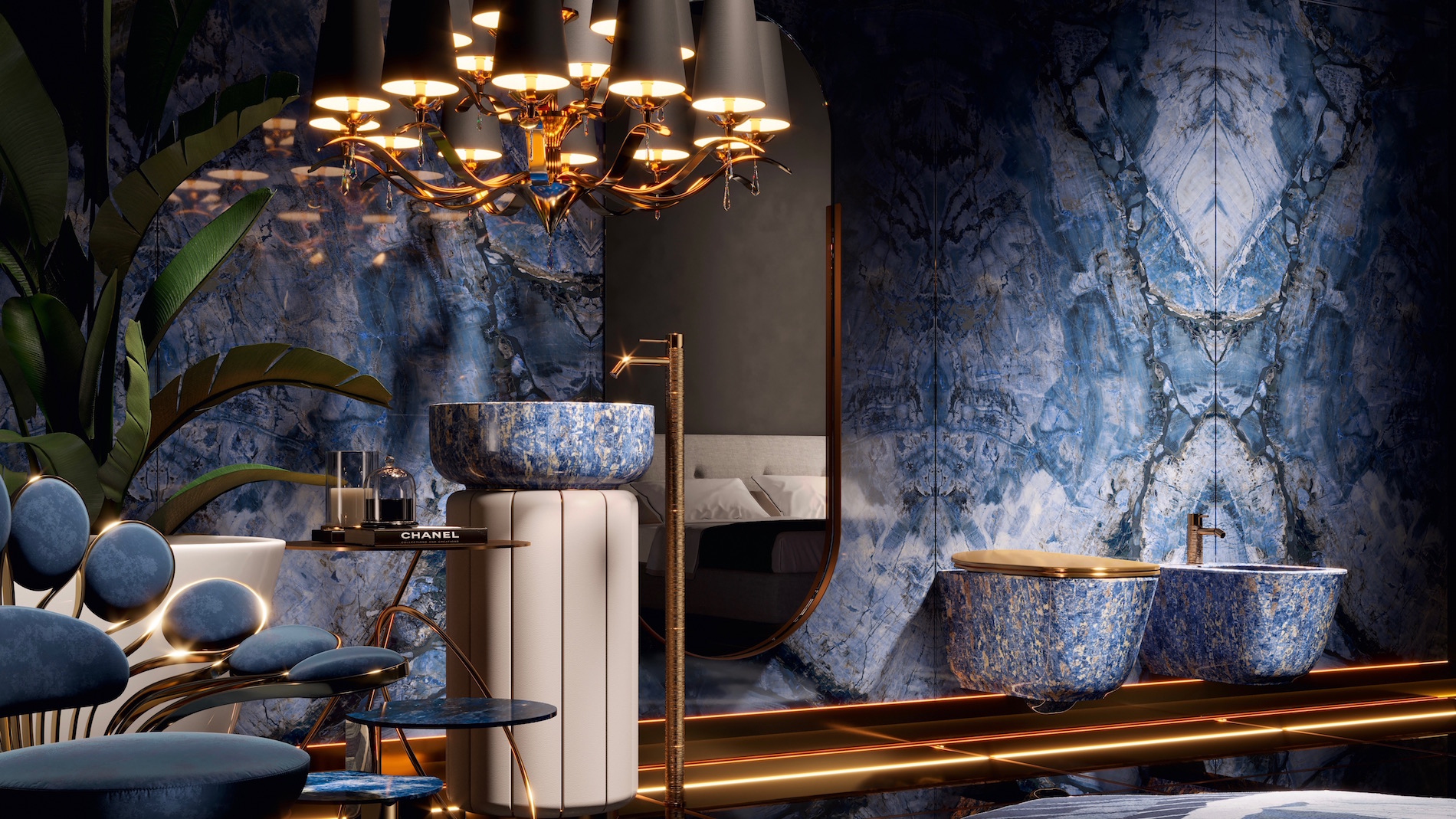 La bellezza vibrante della Sodalite rende la stanza da bagno un luogo emozionante. I mix cromatici che caratterizzano la superficie di questa pietra sono intensi ed eleganti, la sua resistenza la rende molto adatta a svariati utilizzi nell’interior design.