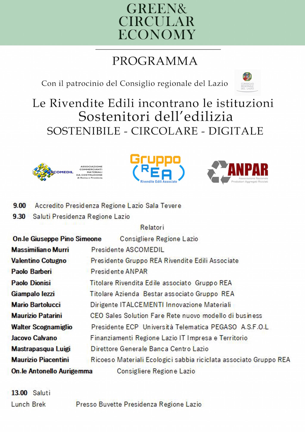 Organizzato da Ascomedil di Roma, il Gruppo Rea e Anpar, con il patrocinio Consiglio regionale del Lazio, il convegno “Green & Circular Economy” è l’occasione per i distributori di materiali da costruzione di Roma e provincia di incontrare le istituzioni sui temi dell’edilizia sostenibile, circolare e digitale.