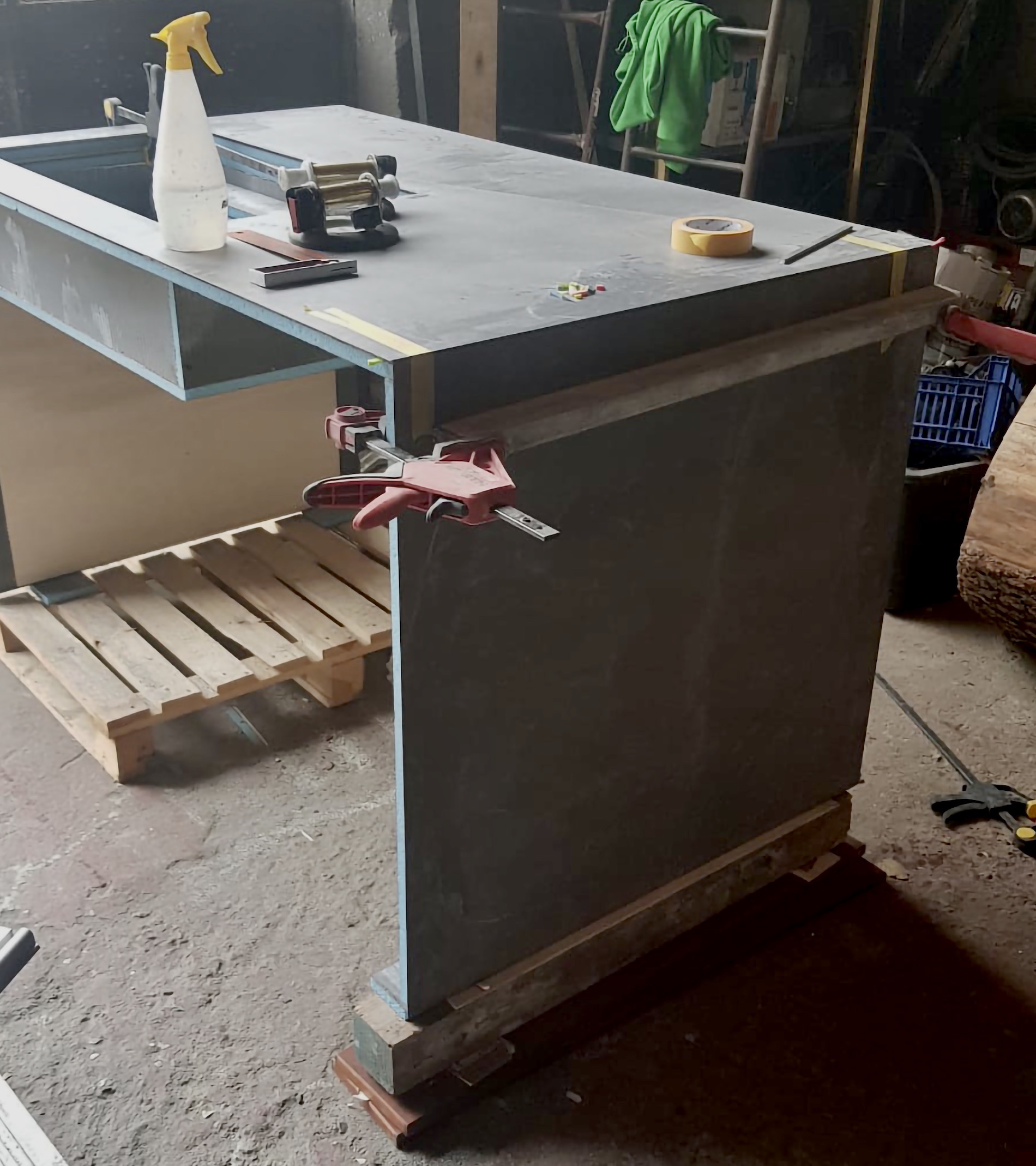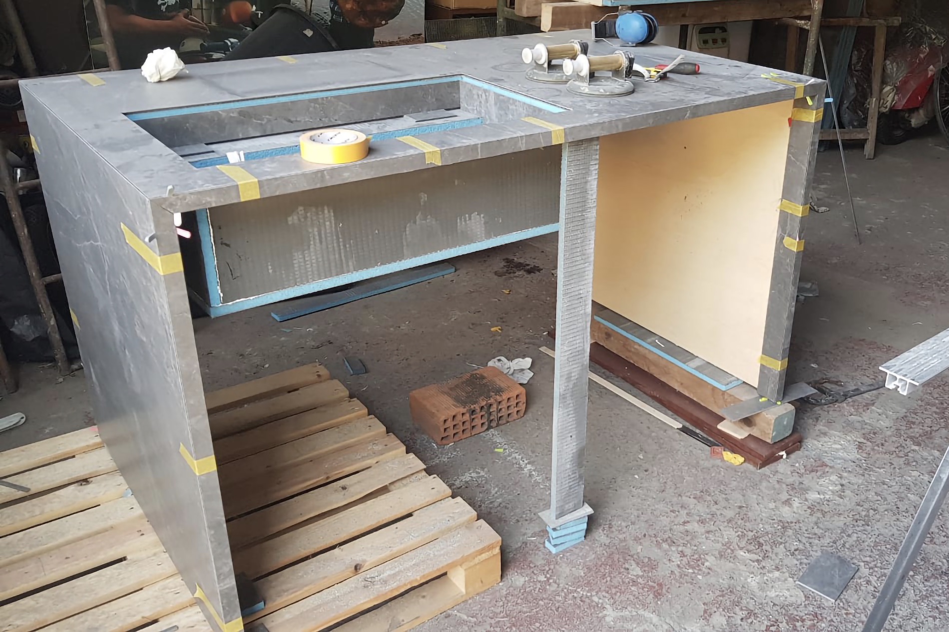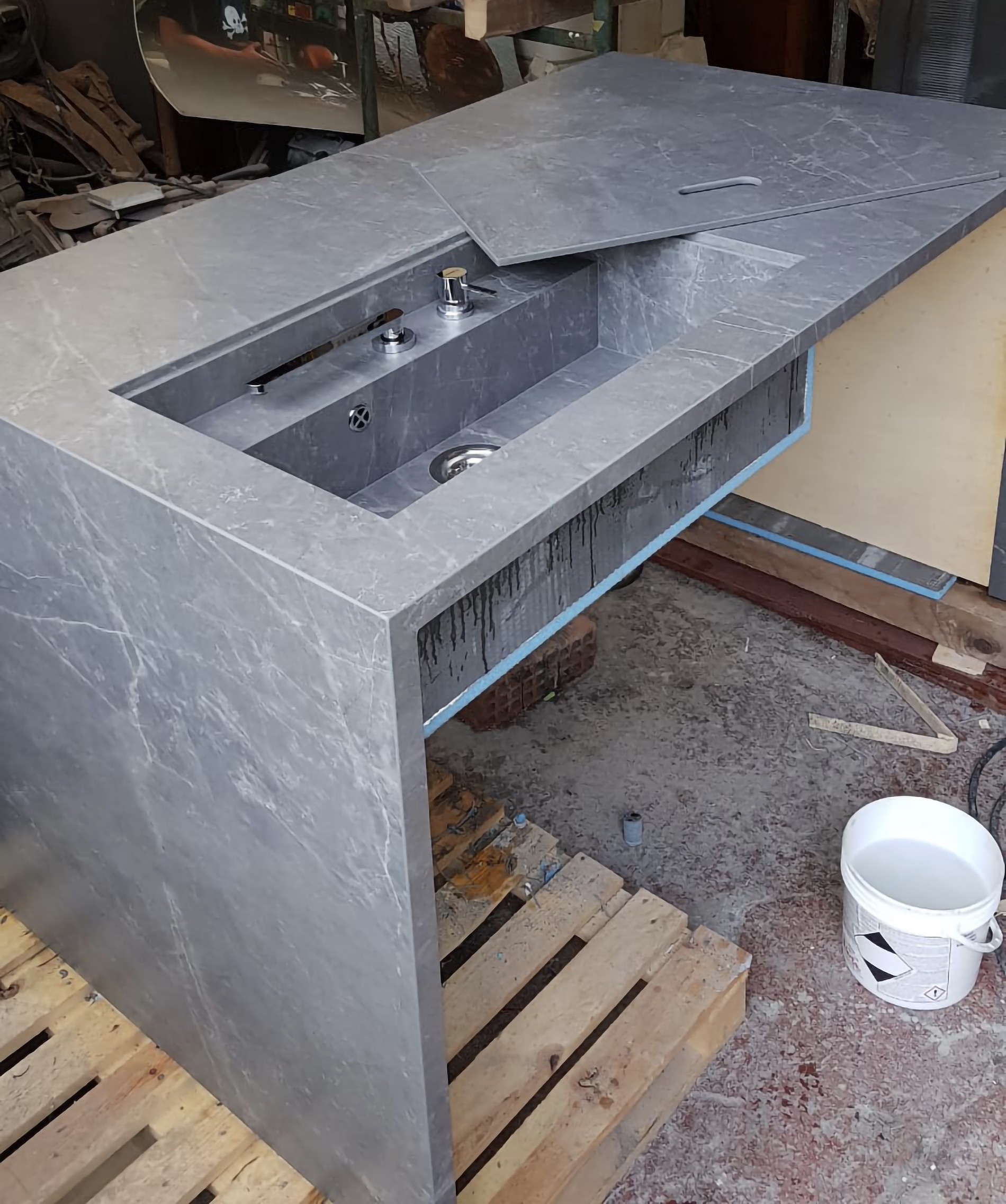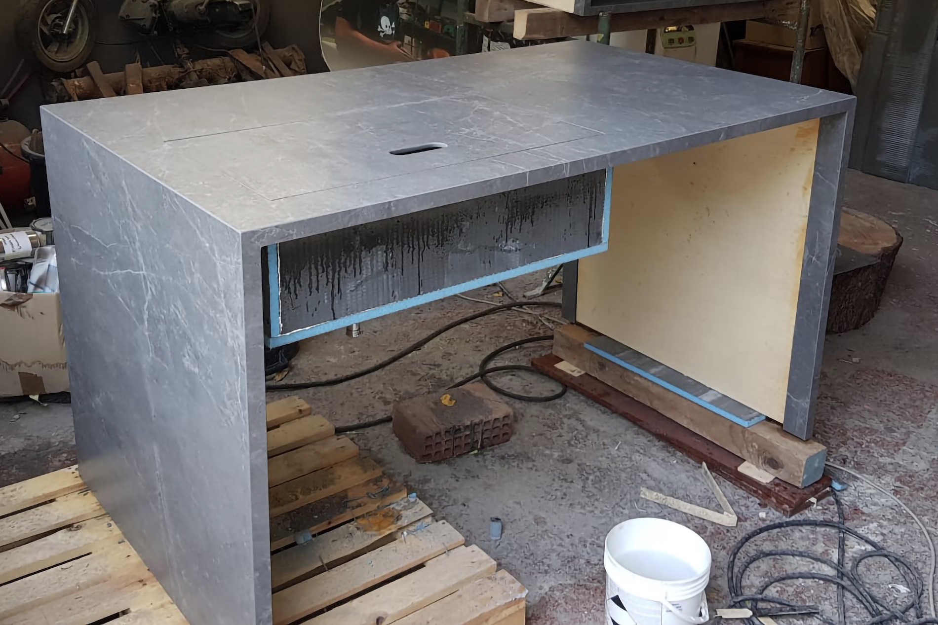 Dall’idea si passa al disegno della struttura, che viene realizzata con pannelli preformati, in questo caso per mille motivi da preferirsi ai materiali tradizionali in laterizio: più leggeri, più facili da lavorare, senza polveri e acqua, offrono una flessibilità di impiego praticamente illimitata e consentono di fare tutto più velocemente e in condizioni di lavoro ottimali. Possiamo distingue tre fasi lavorative: disegno del manufatto, realizzazione del manufatto con incollaggio con adesivi adatti (silicone sigillante Ms polimero) e viti da legno, rivestimento del manufatto.