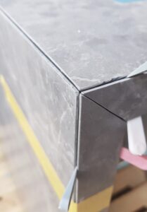 Tutti gli angoli di 45° (cosiddetti Jolly) sono stati realizzati e levigati in opera (in questo genere di lavori, si sa, i profili sono vietati), con grande ma preventivato consumo di dischi per il taglio e di frese.