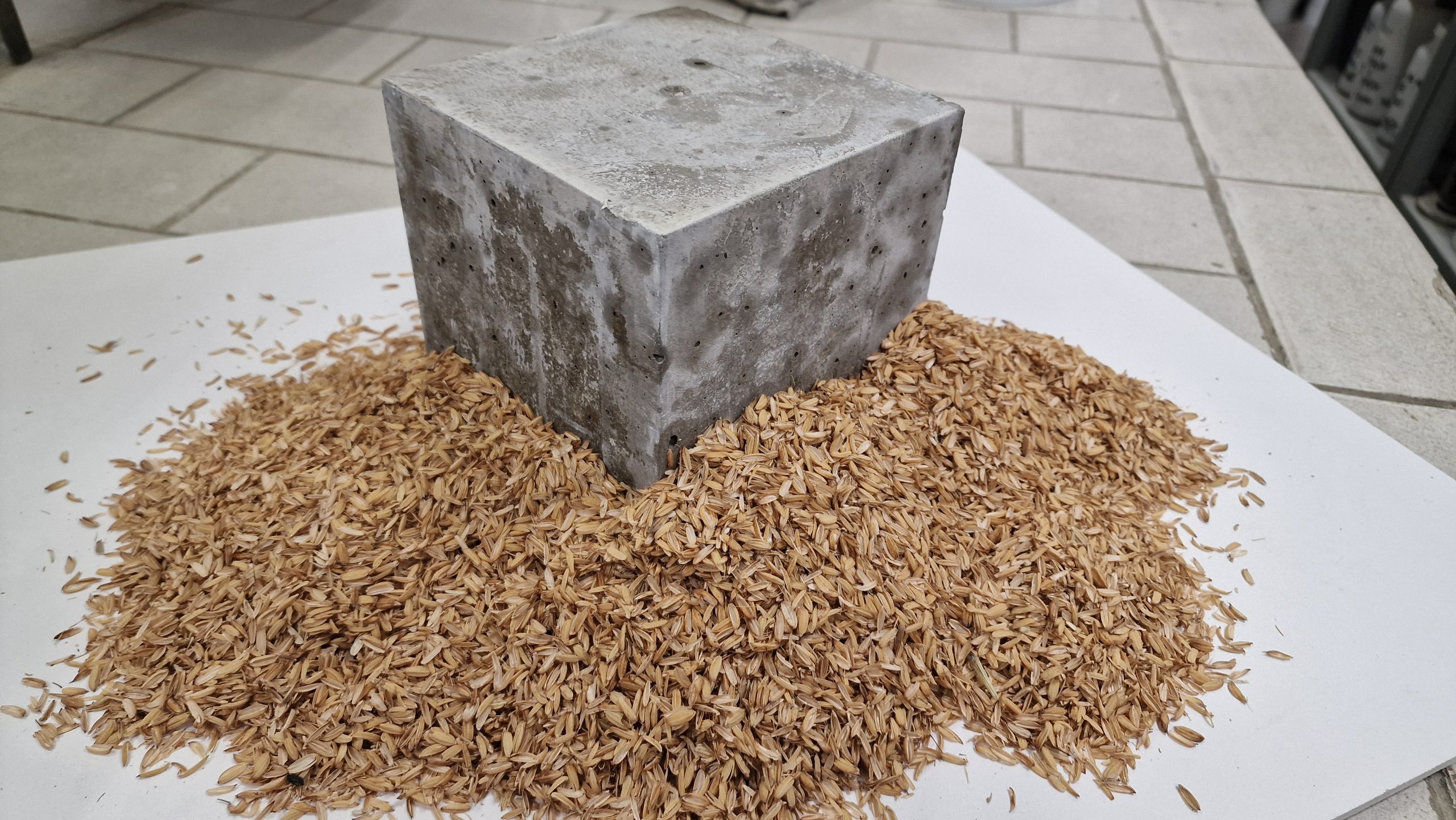 Il secondo materiale sperimentato è la cenere di lolla di riso, derivata dalla combustione del rivestimento esterno del chicco di riso, una risorsa abbondante nel panorama agricolo italiano. Portata a 600°C, la cenere sviluppa proprietà simili a quelle dei fumi di silice, con una percentuale di silice (SiO2) superiore al 90%. I test hanno mostrato che i calcestruzzi prodotti con cenere di lolla raggiungono e superano le performance richieste nel lungo periodo, a conferma del suo valore tecnico e ambientale.