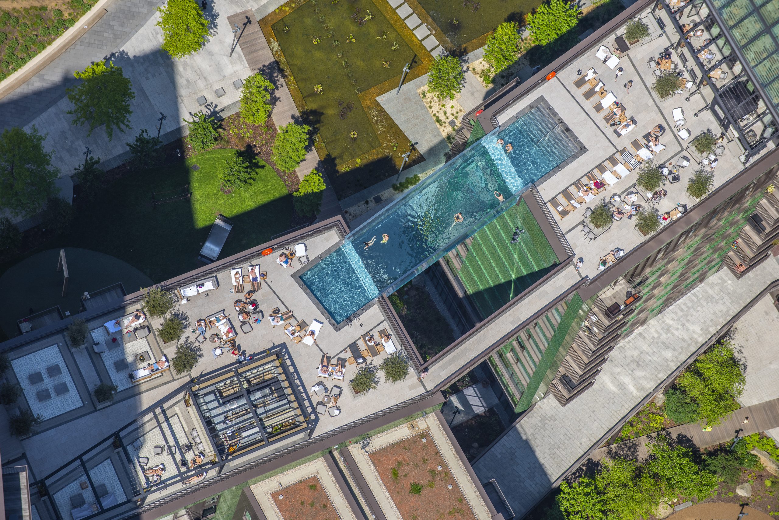 La prima piscina al mondo sospesa è la Sky Pool Embassy Gardens: con i suoi 25 metri, collega i rooftop di due lussuosi grattacieli nel cuore di Londra.