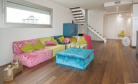 Ideale per case al mare nella versione con giunto in pvc, che le ricorda le ambientazioni navali, il parquet in teak della linea Hi-tech prodotto da Parchettificio Garbelotto e Master Floor è una scelta che unisce comfort e qualità estetica. La superficie, spazzolata, è verniciata all’acqua con effetto cera. Le doghe hanno spessore 1 centimetro, larghezza 12 centimetri e varie lunghezze.