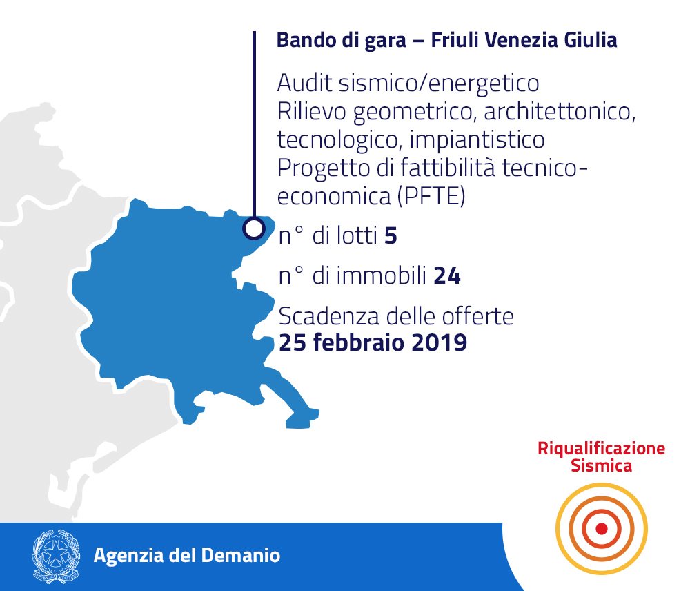 Il bando per la verifica del rischio sismico e i progetti di fattibilità tecnico economica (Pfte) di 24 edifici dello Stato in Friuli Venezia Giulia, pubblicato sulla Gazzetta Ufficiale Italiana, è online nella sezione Gare e Aste: si tratta di una procedura aperta, gestita in modalità telematica, come previsto dal Codice degli Appalti (dlgs 50/16).