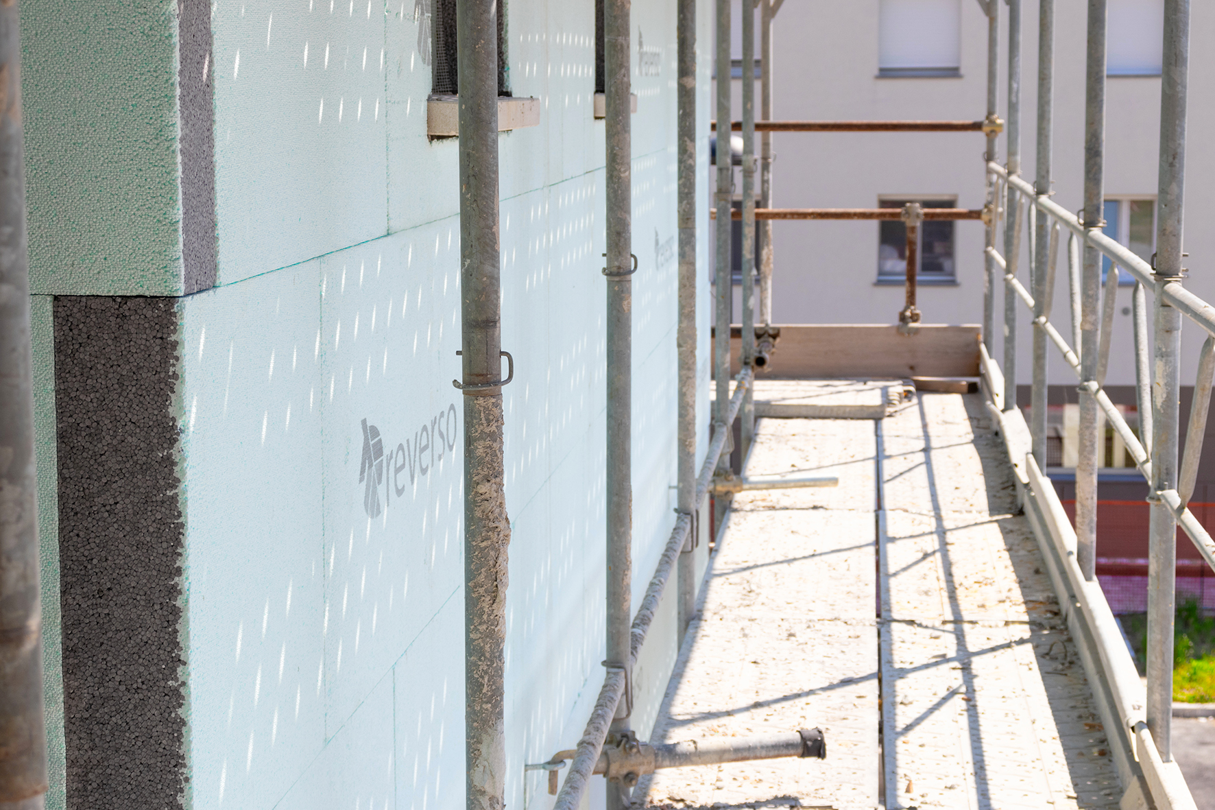 Per realizzare l’isolamento delle facciate dei due edifici, che contano 15 appartamenti ciascuno, sono stati utilizzati circa 3.000 m² di pannelli in Neopor Bmb. Il risparmio di CO2 che ne è derivato è notevole: circa 12 tonnellate rispetto al Neopor tradizionale. Un risparmio derivato anche dal minor consumo energetico necessario per il riscaldamento durante la vita utile del pannello.