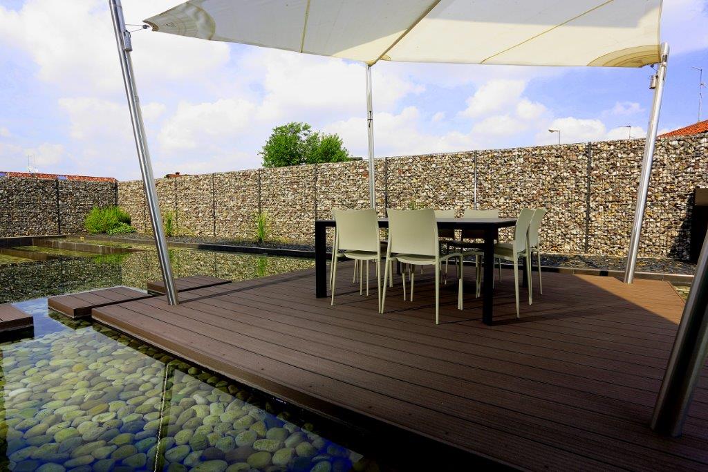 Il salottino a cielo aperto, realizzato su una “zattera” in doghe di legno e sottostante una tensostruttura a vela, ci da come l’illusione di galleggiare. Il fondo delle vasche è impreziosito da ciottoli che richiamano cromaticamente la parete in pietra, posata sia per decorare sia per delimitarne la proprietà. Personalizzabile e resistente, la parete costituita da un doppio pannello in acciaio riempito con materiale ornamentale, si rivela essere una soluzione innovativa Betafence e prende il nome di Zenturo Super come evoluzione del pannello Zenturo.