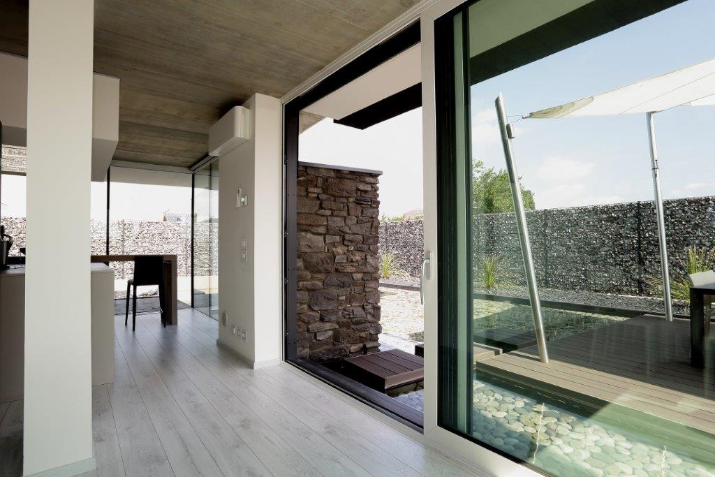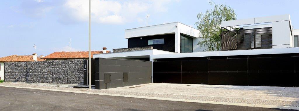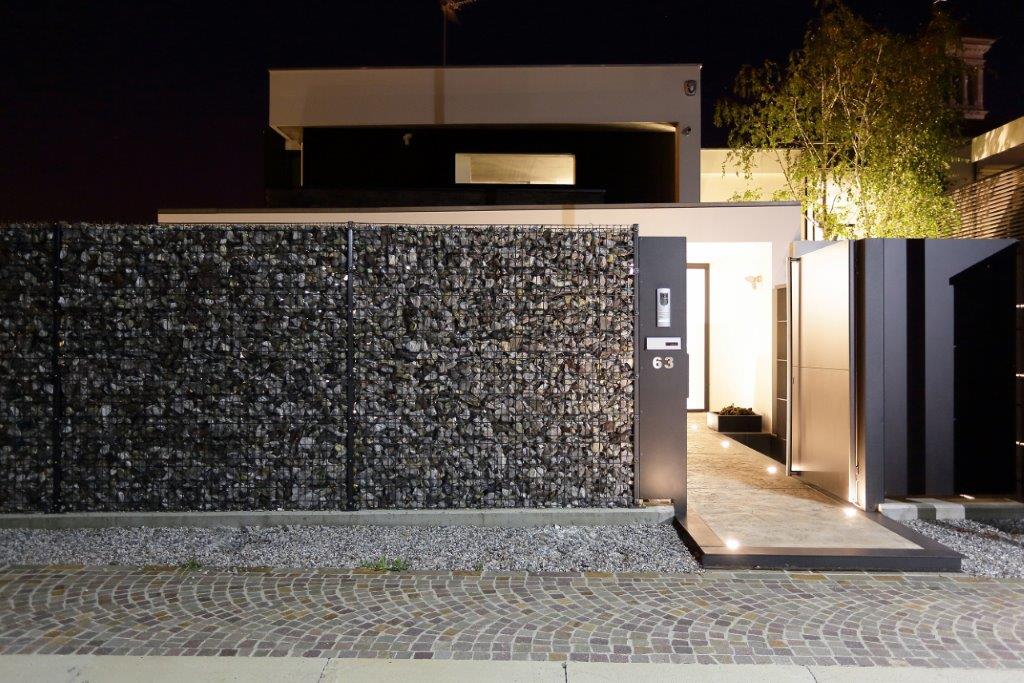 Il progettista della residenza, Antonio Guarneri, ha così motivato la scelta di questa soluzione: ‹‹Lungo il perimetro della casa ho scelto di far installare la recinzione Zenturo Super. Riempibile con i materiali più vari, originali, di riuso o di alto pregio, consente di ottenere pareti decorative estetiche e performanti. In questo caso ho utilizzato ciottoli di fiume di origine locale, di colori grigio-verde e iridescenti››.