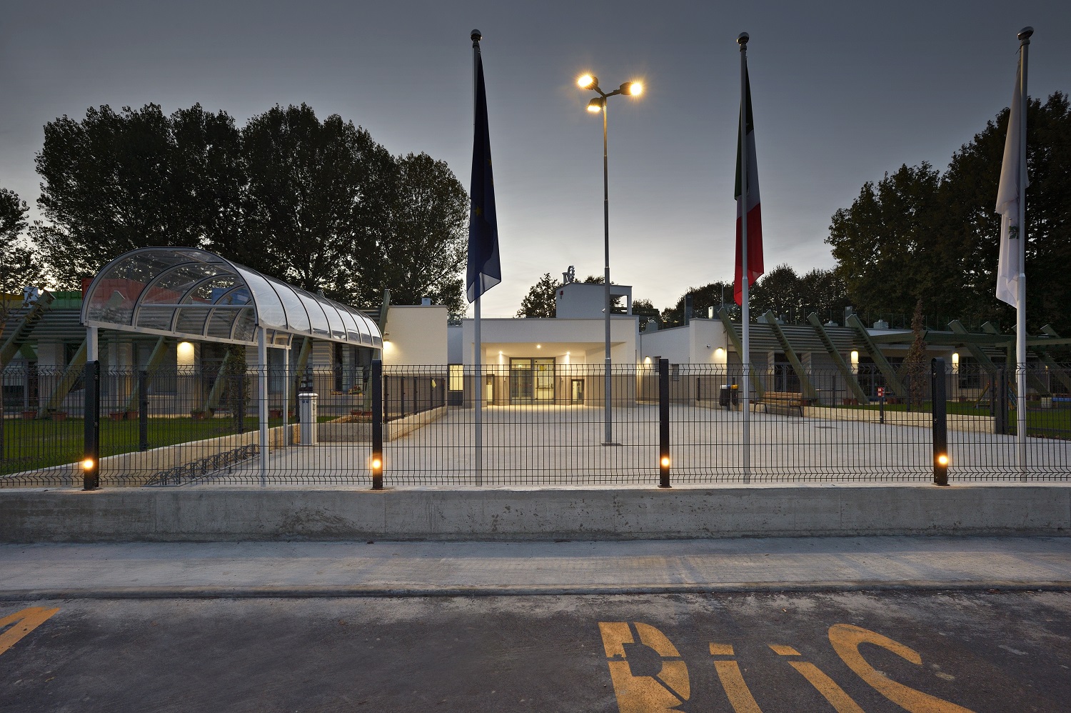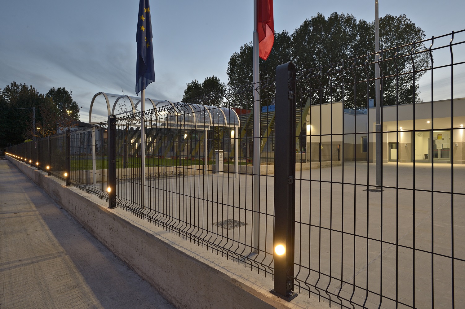 Moderno, eco-compatibile, ad alto comfort, il nuovo complesso anti-sismico nasce in sostituzione delle vecchie scuole elementare e materna, inagibili perché danneggiate dal terremoto. Lo spazio esterno adibito ad area gioco dei bambini è stato reso sicuro e di pregio con una recinzione di design integrata con illuminazione