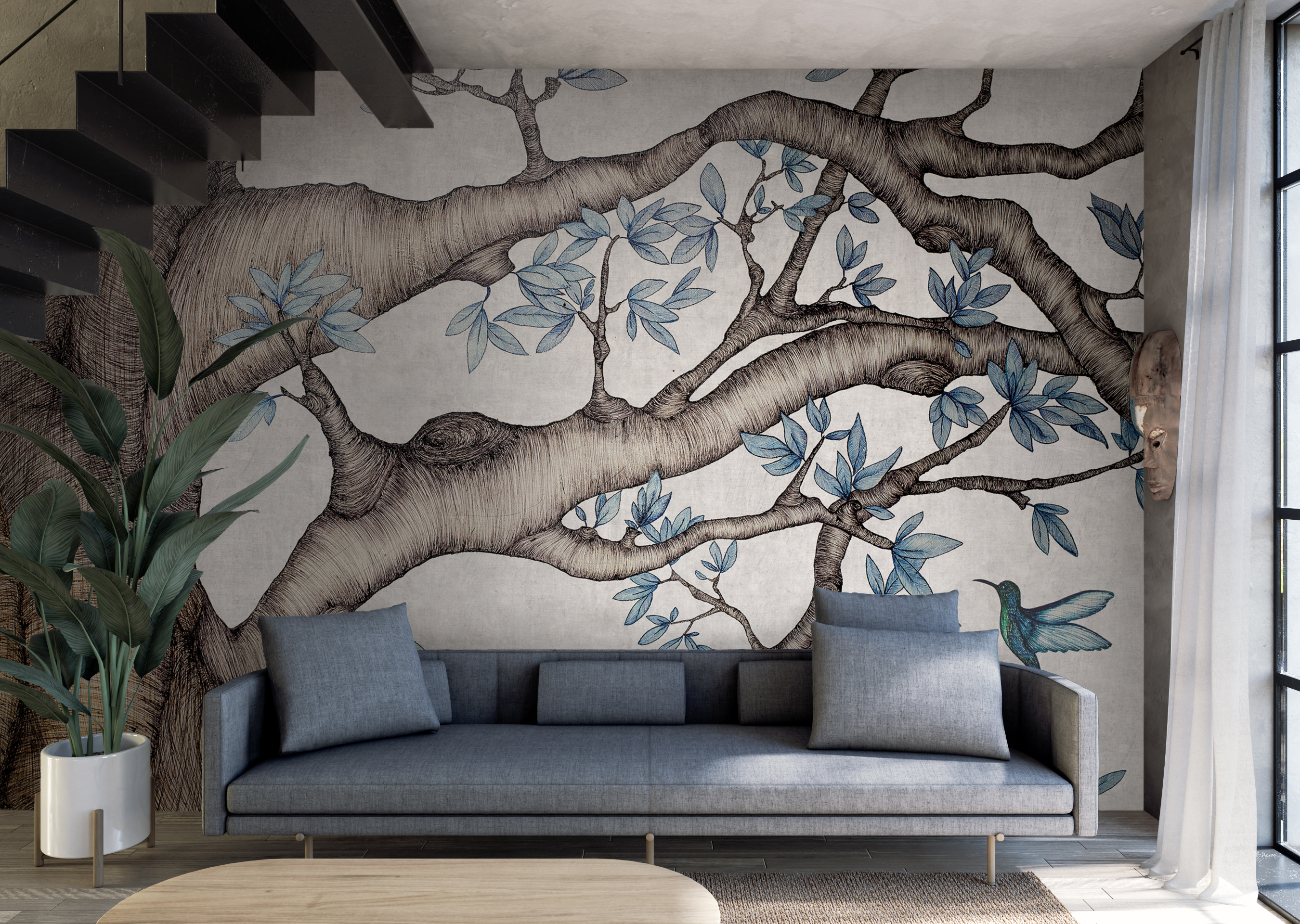 Lei, la luna si caratterizza per il disegno composto da forme geometriche che rievoca il passaggio dal giorno alla notte espresso da un panorama metafisico. In Foliage sono le foglie, con le loro trame e i loro dettagli, ad essere l’oggetto di studio di questa carta da parati.