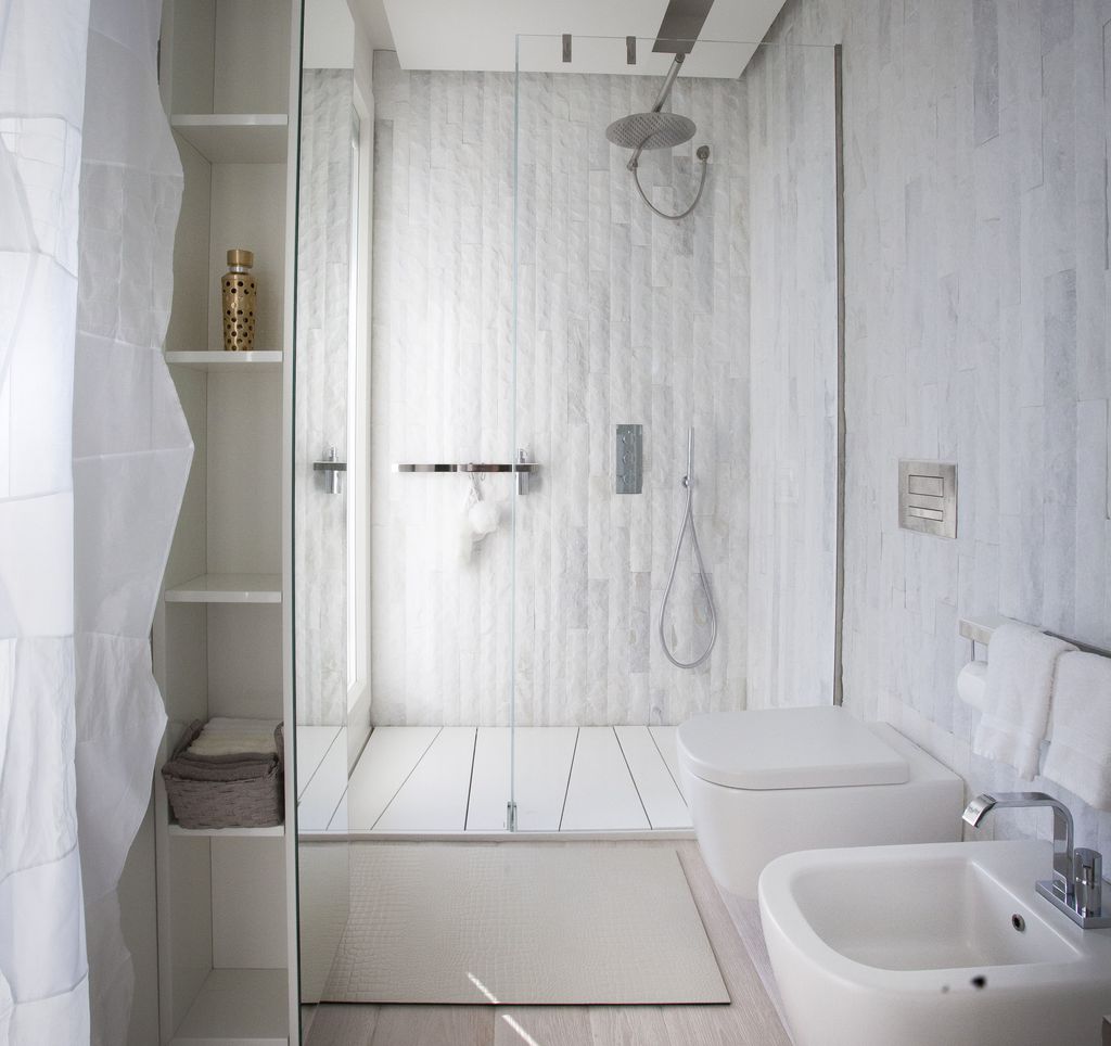 Un’idea per far sembrare il bagno meno piccolo è adottare lo stesso rivestimento per la parete doccia e per il resto dell’ambiente, senza soluzione di continuità, come in questa realizzazione firmata dall’architetto Angelo Pozzoli.