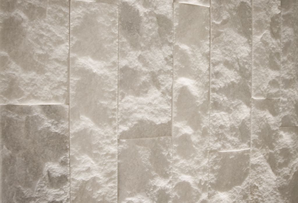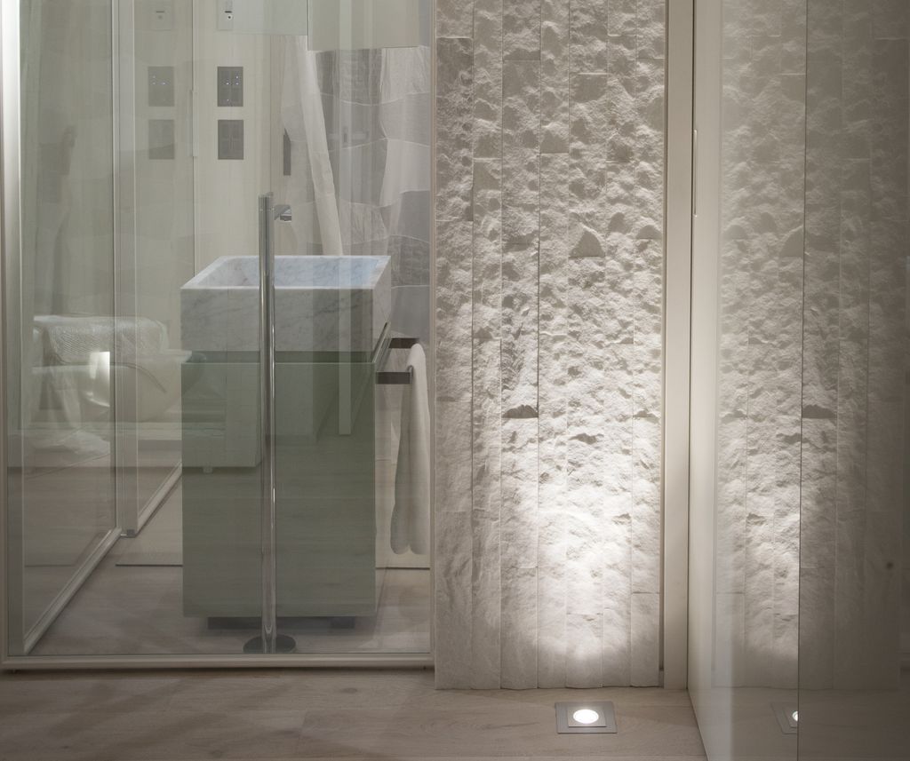 Nel bagno Bianco Lasa, posato in moduli verticali lunghi e stretti con spessore a sbalzo, regala alle pareti una connotazione tattile particolarmente suggestiva (foto di Massimiliano Morlotti)