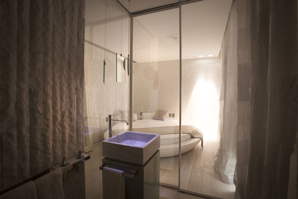La continuità della pietra in spaccatello di marmo Bianco Lasa fornita da Bhc Home Experience utilizzata per tutte le pareti crea un effetto visivo dilatante che enfatizza il pregio formale di questa soluzione a tutto campo.