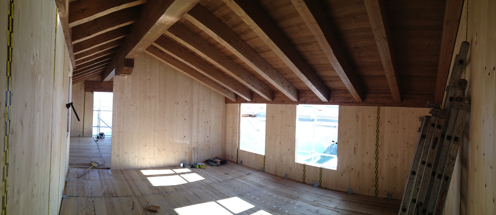 «Abbiamo risolto il problema con una soluzione che potrebbe essere benissimo applicata in altri progetti in altura. Tutti i materiali hanno risposto egregiamente in fase di applicazione e abbiamo portato qualche novità in una zona non abituata a questi metodi costruttivi, come ad esempio l’uso del premiscelato per sottofondi leggeri e isolanti BigCem Classic BigMat by Laterlite, applicato nella zona cantina e nel locale tecnico, materiale idoneo per la veloce asciugatura, la leggerezza e la buona resa» spiega ancora Giovanni Capri. La rapidità delle tempistiche di lavoro, data dalla scelta di costruire a secco e dai trasporti via elicottero che hanno consentito di evitare i tempi morti, ha permesso di completare i lavori in soli 80 giorni, in pochi mesi l’edificio è stato messo a tetto e rivestito. Il tetto isolato è in legno lamellare con falso puntone, tra i materiali anche fibra di legno e alluminio prefabbricato, la copertura è stata eseguita con alluminio Prefa Prefalz color grigio chiaro, con posa in doppia aggraffatura che garantisce un effetto estetico piacevole e una resa alle intemperie maggiore rispetto alla tradizionale pietra valdostana applicata sui tetti a lose, scelta dettata soprattutto dalla più longeva durevolezza alle intemperie e dalla leggerezza nel trasporto in altura dove è difficile reperire materiale lapideo.