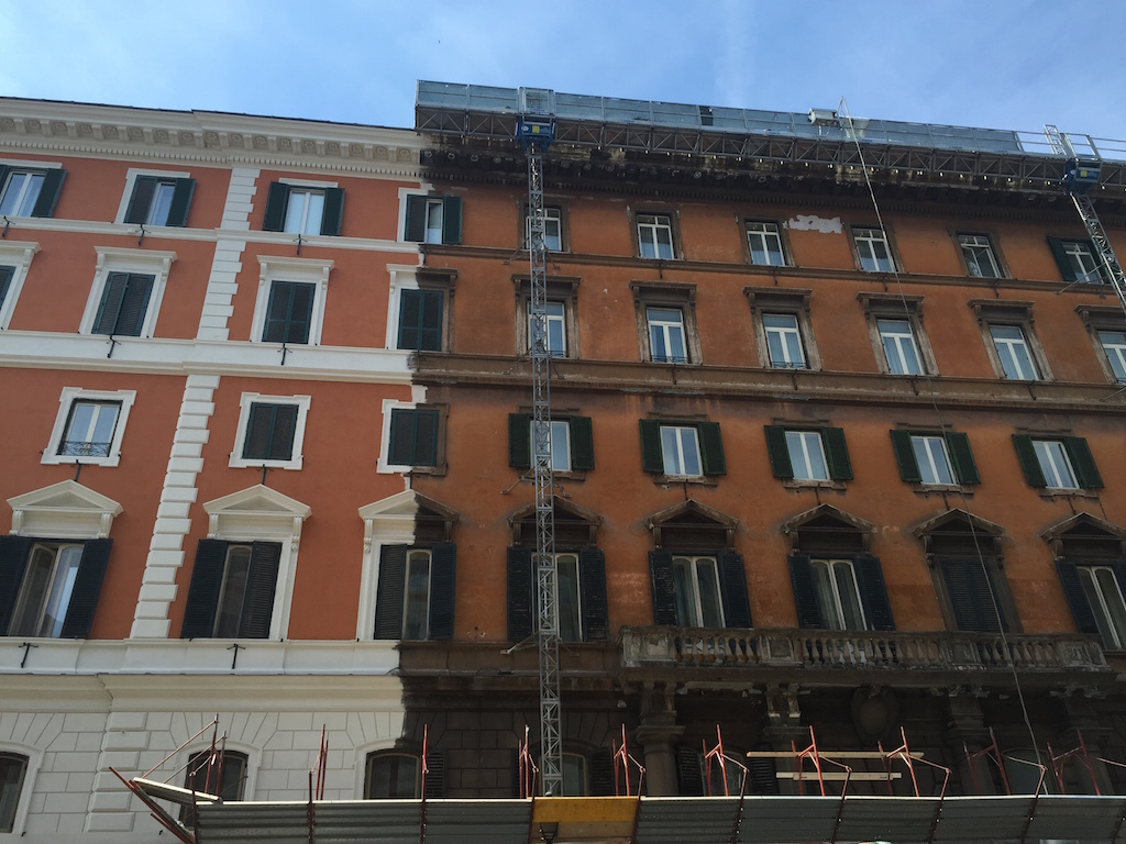 Nel rione Monti di Roma, esattamente in via Nazionale, Palazzo Tenerani dalla destinazione d’uso mista (commerciale, turistico-ricettiva e residenziale) presentava in facciata una serie di problemi causati dal tempo e dalle condizioni atmosferiche: fessurazioni e ammaloramento dell’intonaco in parte liscio e in parte bugnato, delle tinteggiature esterne parietali generali e di finitura, oltre alla presenza di coloriture diverse nella zoccolatura del piano terra. All’atto dello studio, condotto da Lino Perfetti dello Studio Tecnico MoMe di Roma, per il progetto dei lavori di manutenzione ordinaria delle facciate, approvati dal Mibac Soprintendenza per i beni architettonici e paesaggistici per il Comune di Roma, erano stati rilevati ammaloramenti importanti delle fasce marcapiano, del cornicione e per quanto riguardava le ardesie di copertura. Per preservare il valore e l’aspetto estetico dell’edificio è stato proposto un immediato risanamento degli intonaci, la risarcitura delle fessurazioni e una nuova tinteggiatura di tutte le superfici verticali, con un’attenzione particolare nel mantenere la tinta originale. Il colore ideale per questa tipologia di intervento è stato scelto, nel ventaglio dell’offerta Kerakoll, tra quattro campioni della gamma Kerakoll Prodotti Bio, pitture e finiture naturali e traspiranti della linea Silicati Puri e Grassello di Calce (Kerakover Eco Silox Pittura MB GD, Kerakover Eco Silox Pittura NT GD e Keradecor Eco Lux Nero Seppia).