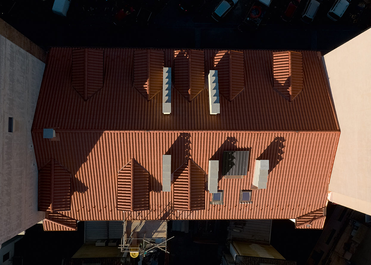 Per il rifacimento della copertura di questo complesso residenziale, è stato scelto Coppo Domus Bmi Braas, il coppo leggero, versatile e veloce da posare. Ha l’aspetto di un coppo realizzato a mano, artigianalmente, e la sua ‘onda alta’ riproduce perfettamente i coppi antichi.