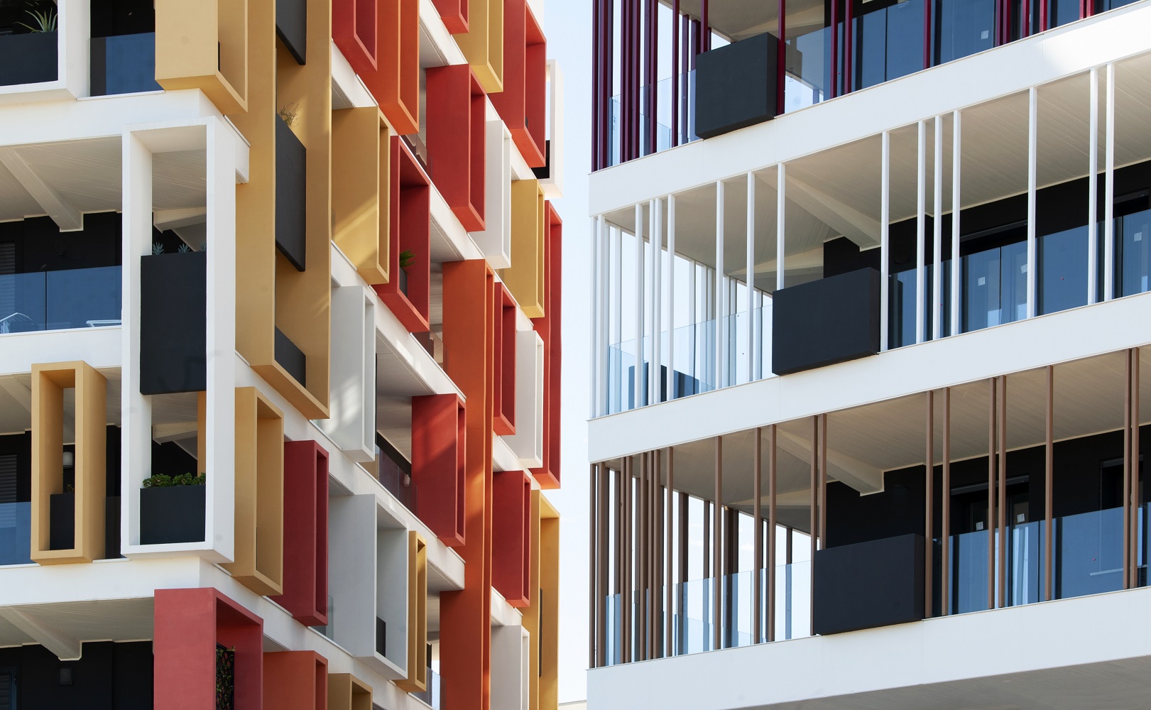 In questo contesto il colore gioca un ruolo importante nella caratterizzazione degli edifici: bianco, rosso, nero, arancione e giallo sono le tonalità che distinguono gli edifici conferendogli una personalità unica. I colori intensi e saturi si mixano con i materiali utilizzati nel progetto tra cui troviamo il metallo, il legno e il vetro.