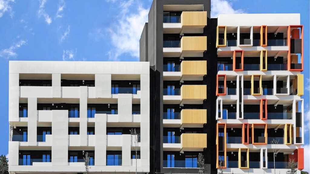 Una gerarchia di colori in cui le parti arretrate dell’edificio presentano tonalità scure, mentre quelle in primo piano risaltano grazie all’uso di colori e materiali differenti tra loro. Il risultato finale crea un effetto cromatico estremamente elegante che si integra in modo perfetto con le forme articolate degli edifici.