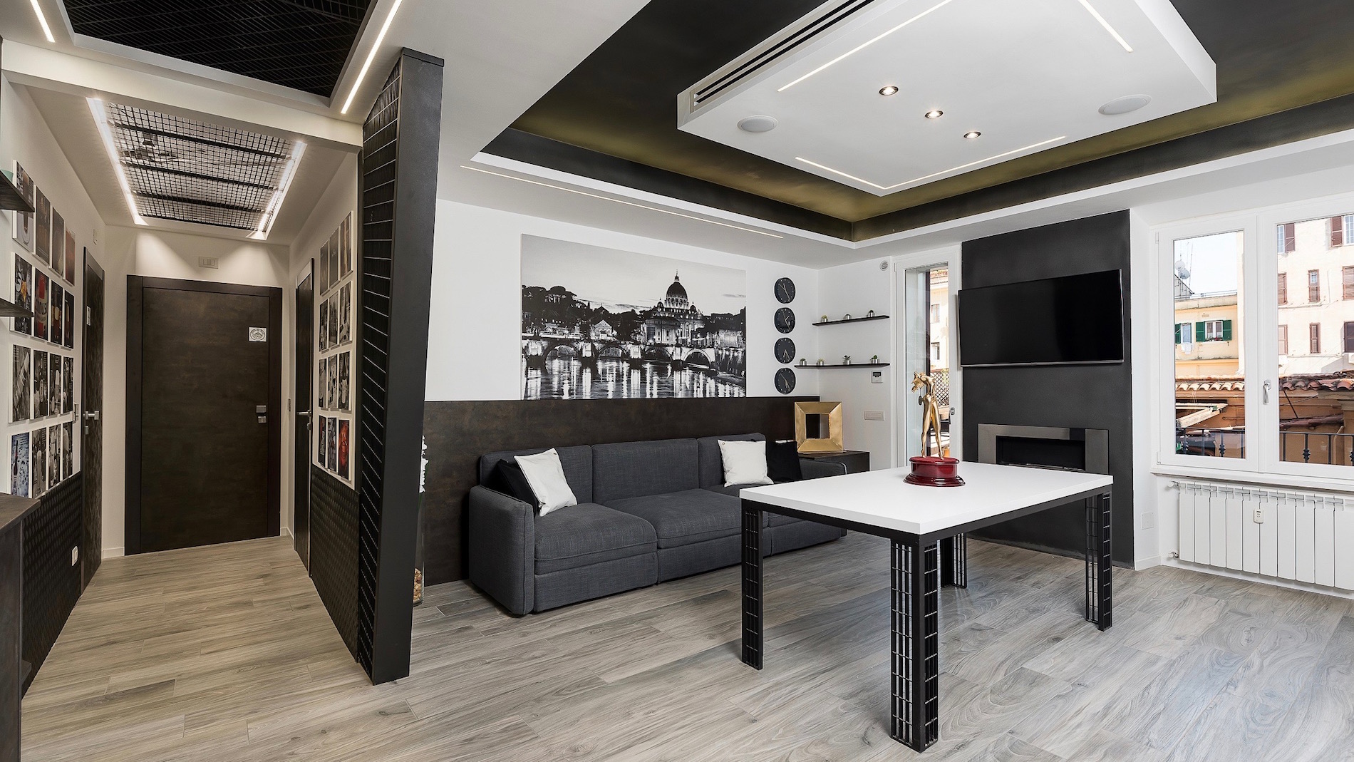 Il controsoffitto del corridoio è stato, invece, realizzato con un grigliato prodotto dall’azienda Keller e verniciato con lo smalto anticorrosivo a grana grossa Ferropiù, nel colore nero grafite.