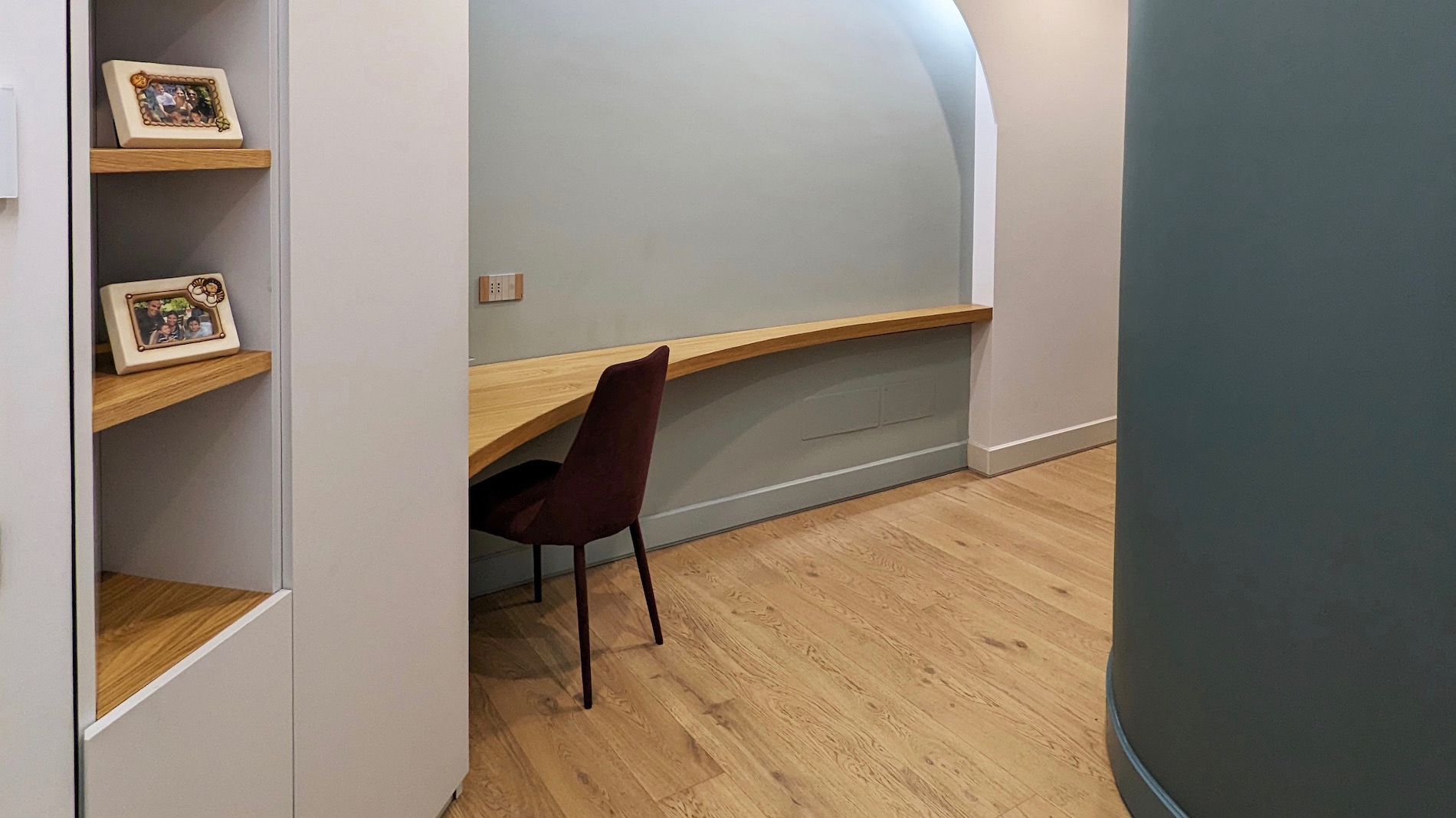 Nella zona notte, ogni camera è stata personalizzata secondo il carattere di chi la vive. La camera padronale è stata resa raffinata e accogliente grazie al tenue color terracotta (codice NT-0633), che evidenzia il letto e il soffitto, creando un suggestivo effetto baldacchino che evoca un rifugio rilassante.