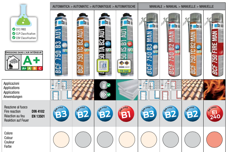 Classificate A+ in accordo al decreto francese Cov, le schiume Bossong Bcf 750 (che sono Cfc-Hcfc free), sono idonee per tutti i materiali da costruzione, ma non adeguate per polietilene, polipropilene, teflon, silicone, oli e grassi, prodotti di separazione o simili.