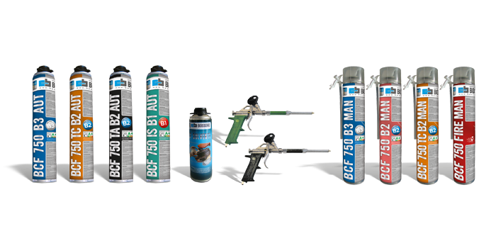 Le schiume poliuretaniche monocomponenti Bossong Bcf 750, che reagiscono con l’umidità che ne provoca l’indurimento, dopo la loro applicazione devono essere protette dai raggi Uv. Queste schiume, disponibili nella versione automatica, per la quale sono disponibili le pistole dosatrici Boss 750 A e Boss 750 Ec, e manuale hanno valori di isolamento termico e di insonorizzazione molto elevati e sono state pensate per specifici ambiti applicativi.