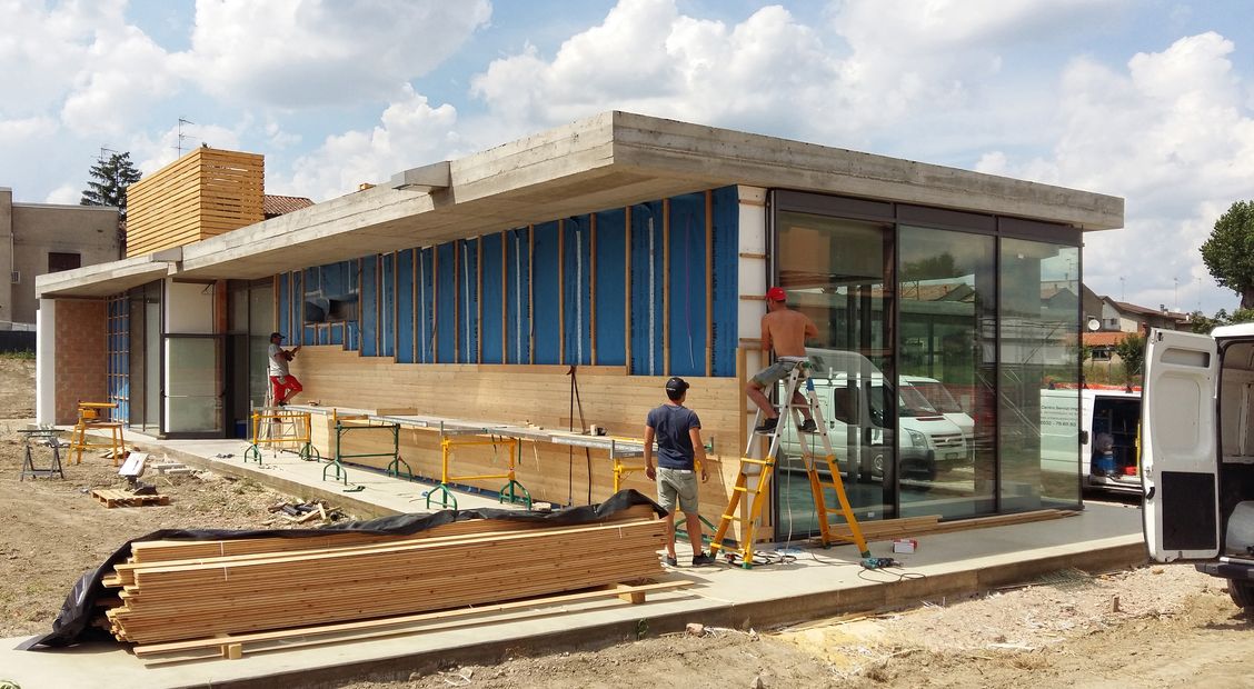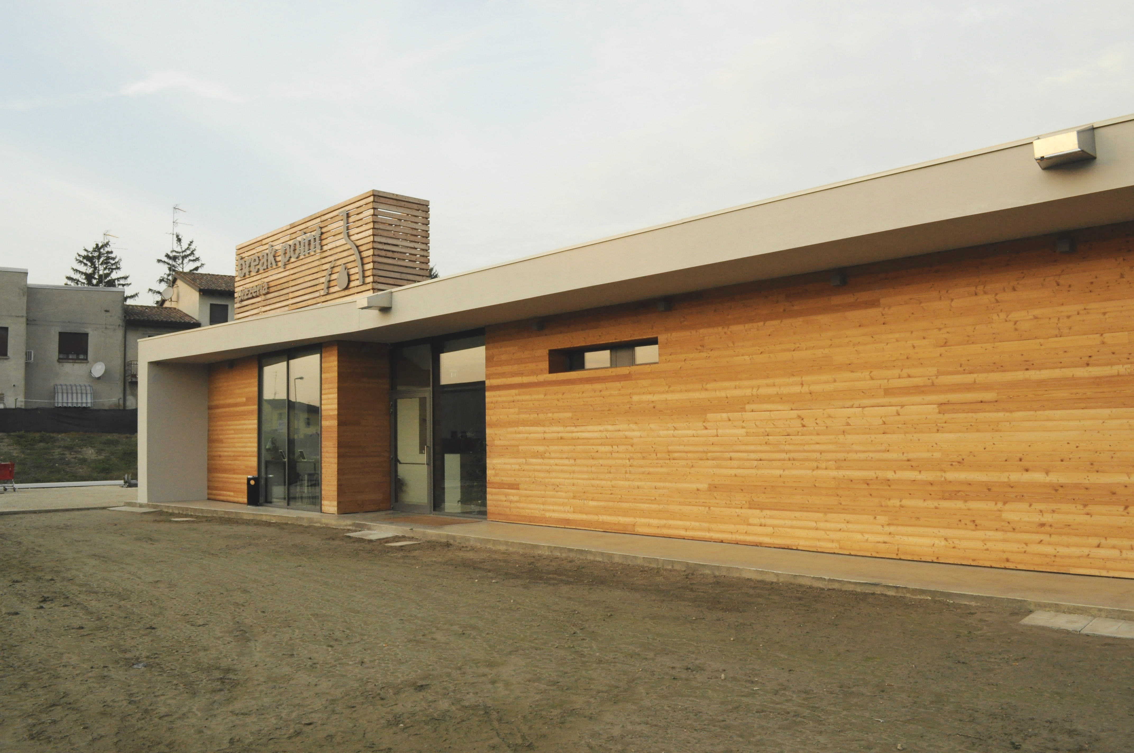 «I materiali utilizzati sono stati lasciati nel loro stato naturale, i pilastri in cemento armato restano tali all’occhio, i pilastrini leggeri in acciaio zincato portano i segni del cantiere, la soletta in cemento fa da pavimentazione continua tra interno ed esterno senza tagli di dilatazione e con fessurazioni casuali, la struttura portante si percepisce nel suo stato grezzo, il legno di larice utilizzato è lasciato al naturale sia in esterno sia in interno. La cura al dettaglio è incentrata solo nell’attenzione alla realizzazione degli elementi strutturali. La pulizia comunicata dagli elementi costruttivi a vista fa percepire un senso di spazio industriale povero e privo di finzioni, ma prestante e ben definito architettonicamente. In altre parole l’architettura di questa costruzione assume un carattere differente rispetto all’adiacente tessuto urbano: infatti si è voluto capovolgere il processo costruttivo radicato nell’edilizia residenziale diffusa secondo cui non hanno importanza i materiali da costruzione scelti, né l’edificio allo stato grezzo perché saranno poi cappotti, intonaci, rivestimenti e contro-rivestimenti a darne la sua immagine finita. Poche le fasi di cantiere che hanno lasciato qualcosa di non visibile in questo edificio. Forse solo le fondazioni sarebbero sparite proprio perché sotto il livello del terreno, ma già la casseratura dei pilastri in cemento armato avrebbe definito la superficie visibile di questi elementi portanti agli angoli delle sale del ristorante. Molta cura è stata riposta nella composizione del getto in cemento e anche nelle fasi successive di disarmo e pulizia dei due pilastri d’angolo, unici elementi verticali massivi. In aggiunta a questi solo degli esili pilastri di tredici centimetri di diametro in acciaio zincato a sorreggere la parte alta della superficie continua ripiegata del fabbricato».