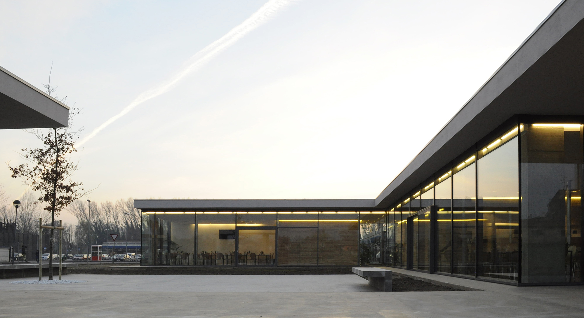 Elemento distintivo dell’edificio è la lunga linea vetrata che separa e collega l’edificio allo spazio aperto esterno e che, allo stesso tempo, illumina e amplifica l’interno portando dentro luce naturale e spazio, rischiarando l’esterno nelle ore notturne lasciando uscire luce artificiale come un’enorme lampada.
