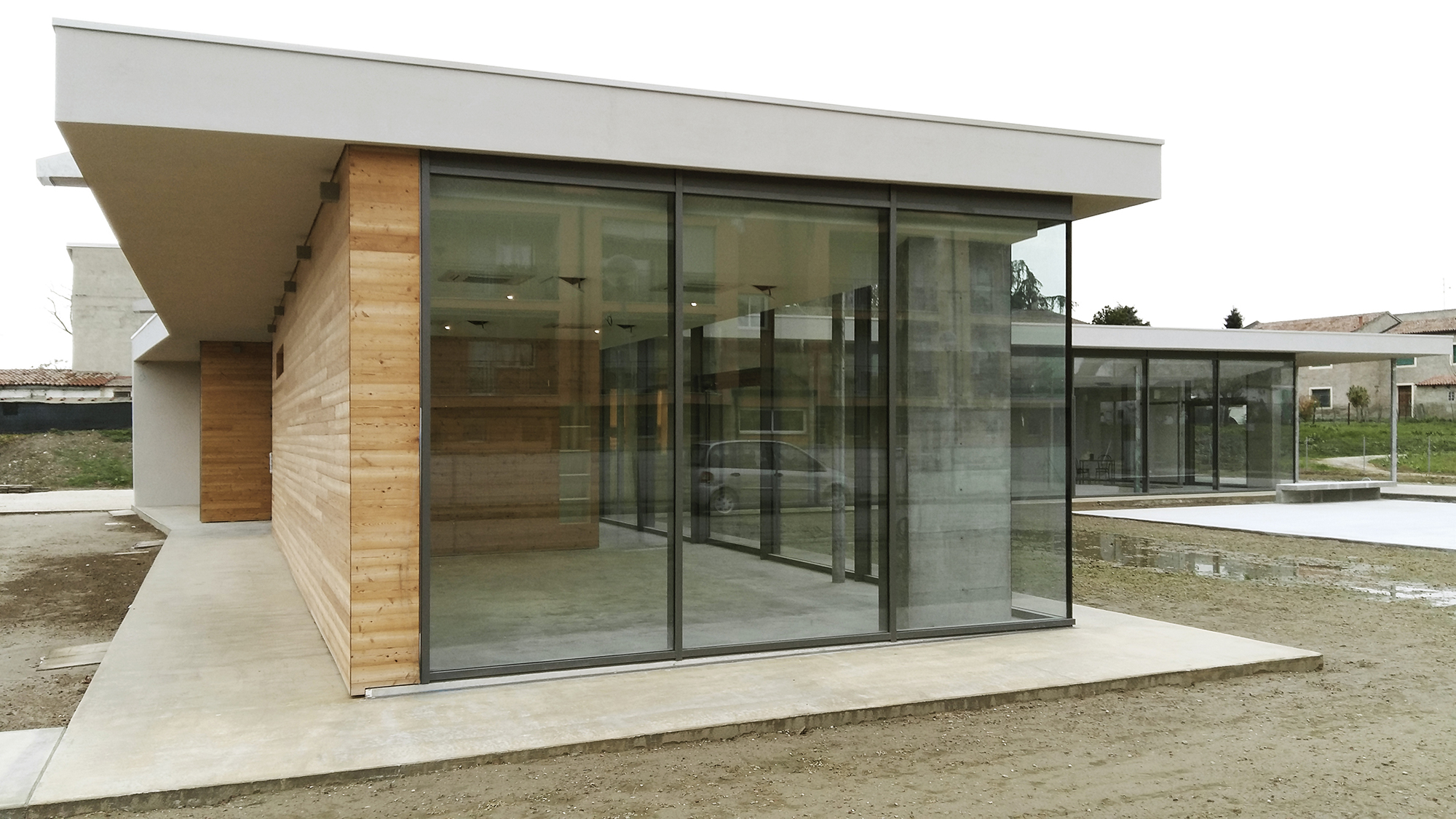 L’edificio ha avuto tra le sue finalità il completamento e l’integrazione del tessuto edilizio che circonda il parco. La superficie è sviluppata su un unico livello e uno dei suoi elementi caratterizzanti è la lunga linea vetrata alla quale si contrappongono le superfici lignee che delimitano le scatole funzionali di servizio.