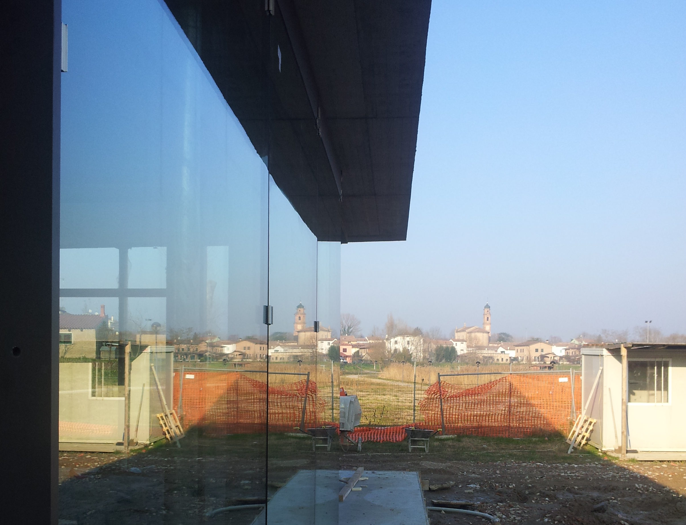 Vista interna dallo spazio compreso tra la scatola lignea degli spazi di lavoro e la vetrata continua in direzione del campanile.