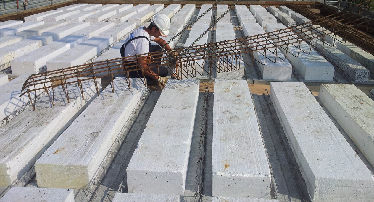 Preparazione e armatura della copertura in lastre predalles prima del getto in opera.