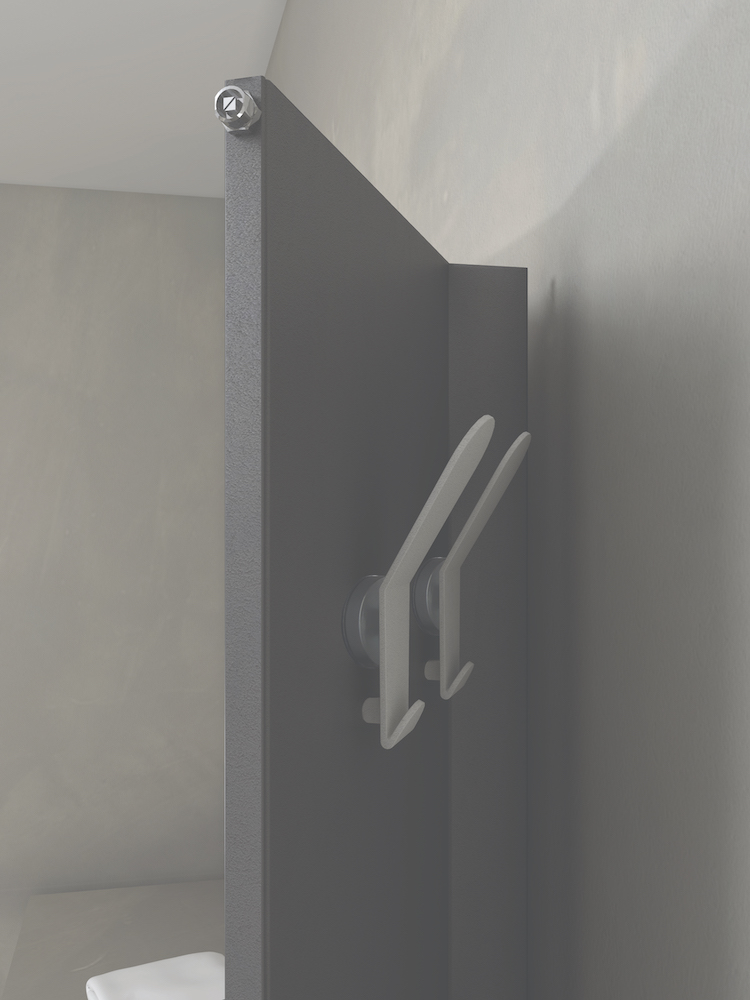 Veletta è composto da una piastra radiante, divisa in due da una piega netta, crea un’ala distaccata dal muro, dietro la quale, grazie a pomoli magnetici, è possibile appendere la biancheria.