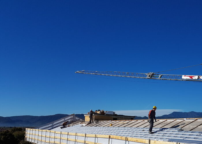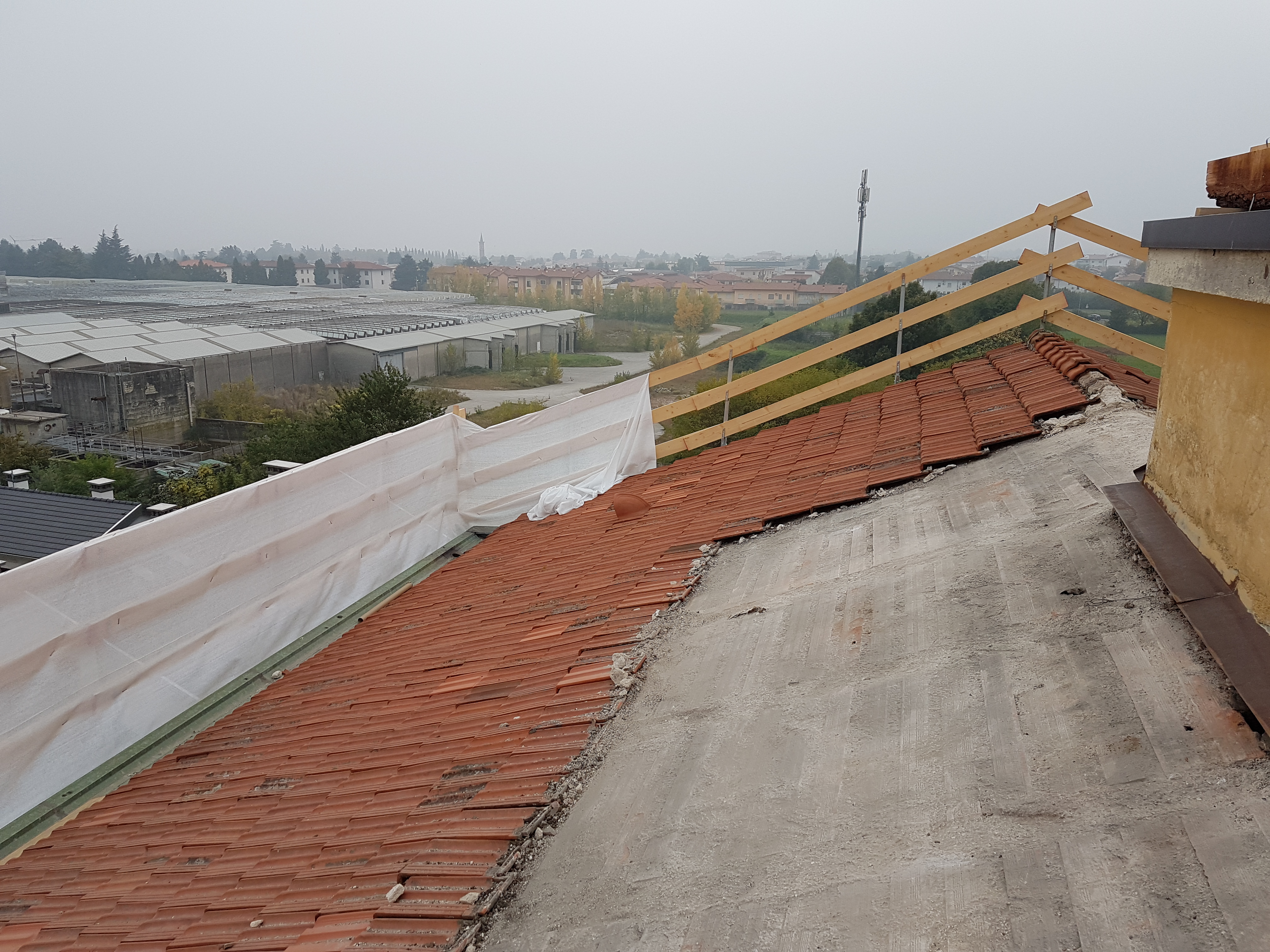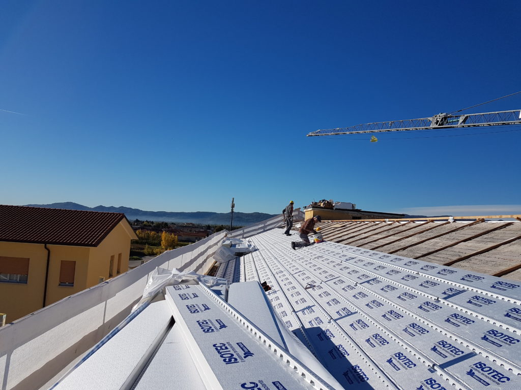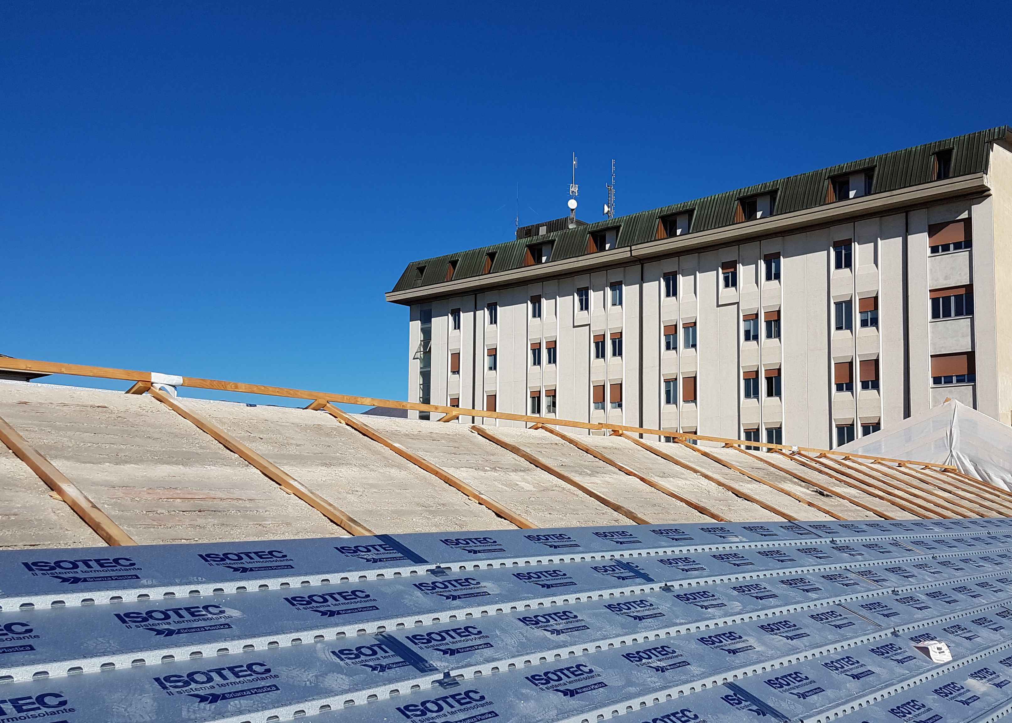 Il vecchio edificio presentava una struttura in laterocemento rivestita con tegole, fissate direttamente ad essa mediante la malta. Il naturale invecchiamento, accelerato dalla mancanza di ventilazione, ha portato al deterioramento e alla rottura di molte tegole, causando le infiltrazioni. Per risolvere tali problematiche in maniera efficace è stato scelto il sistema termoisolante Isotec di Brianza Plastica, un sistema completo per coperture ventilate costituito da pannelli in poliuretano espanso rigido rivestiti da una lamina di alluminio che li rende impermeabili. I pannelli Isotec sono dotati di un correntino metallico asolato, integrato nei pannelli stessi in fase produttiva, che svolge la doppia funzione di supporto per le tegole e di creazione di una camera di ventilazione sottotegola.