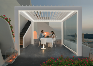 Pergospace R640 di BT Group è una pergola bioclimatica autoportante in allumino dal design ricercato e moderno. In base all’orientamento delle lamelle che compongono la copertura superiore, la struttura offre protezione totale o parziale dal sole, una perfetta climatizzazione e un sicuro riparo dalla pioggia, diventando uno spazio esterno da vivere in ogni condizione climatica.