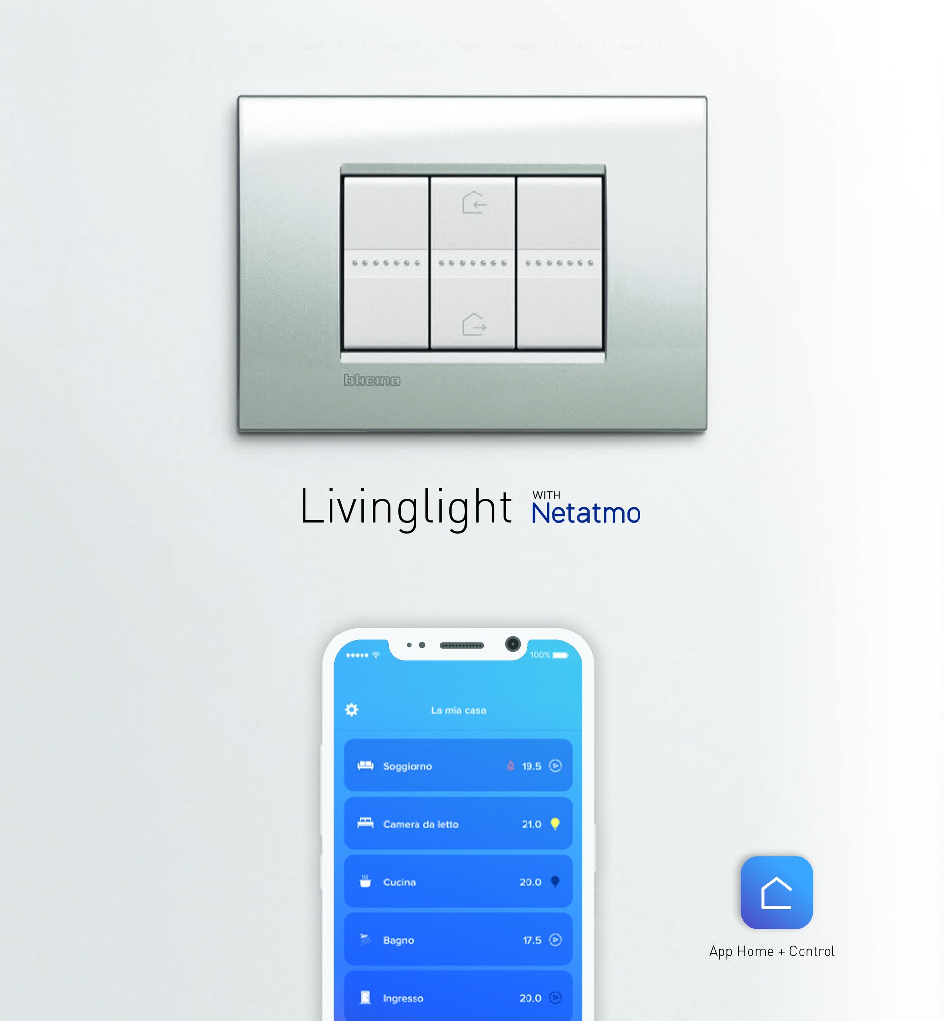 Per quanto riguarda l’installabilità, Livinglight with Netatmo si installa utilizzando le scatole da muro e supporti standard e le tradizionali placche della serie Livinglight in tutte le finiture.