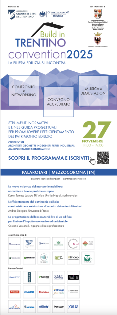 Dopo il successo della prima edizione del 2024, torna al Palarotari di Mezzocorona Build in Trentino – Convention 2025, l’appuntamento che unisce tutti gli attori della filiera edilizia trentina. Promossa dall’Associazione Grossisti e Pmi del Trentino e da Confcommercio Trentino, la giornata si terrà giovedì 27 novembre dalle 14.00 alle 19.00, con un programma ricco di contenuti, momenti di confronto e networking.