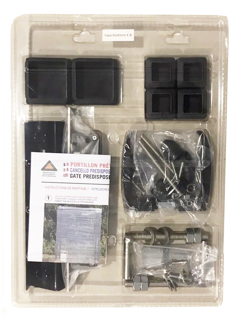 Ferro Bulloni fornisce i suoi cancelli completi di tutti gli accessori confezionati in un pratico blister contenente cerniere regolabili e bullonerie in acciaio inox, maniglia doppia, serratura, 3 chiavi e relative istruzioni di montaggio, che rendono semplice e veloce l’assemblaggio e la posa.