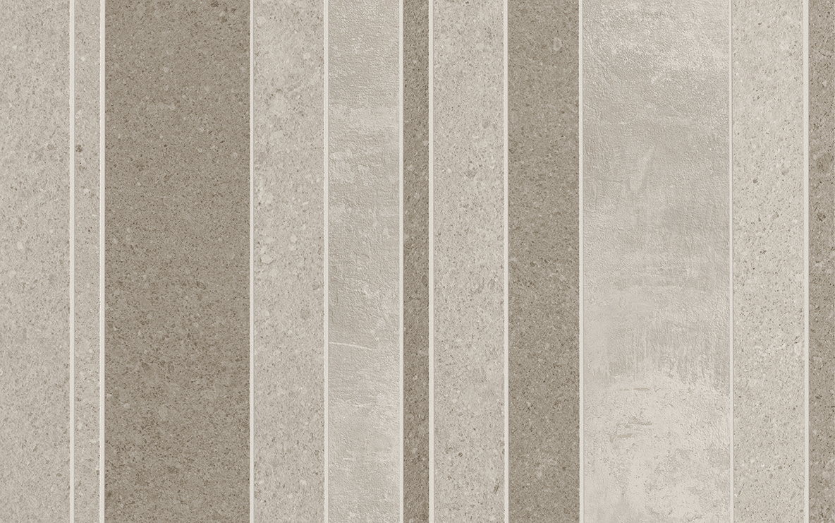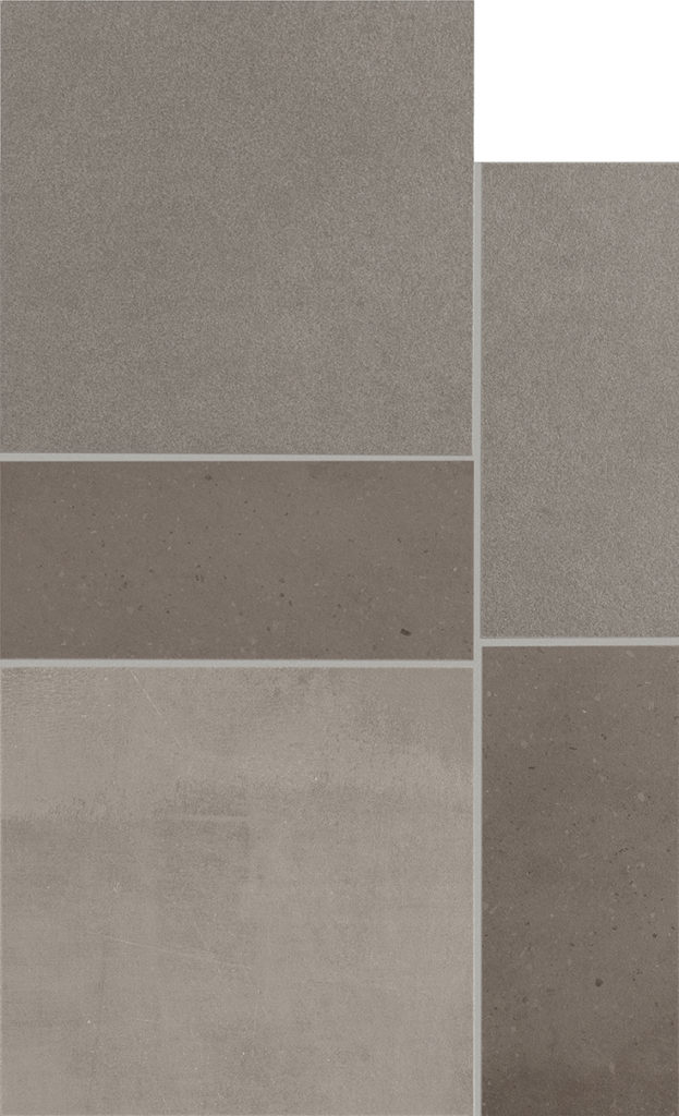 Il progetto è articolato in quattro mosaici in gres porcellanato, ispirati al mondo dei cementi e delle pietre minimal, declinati in tonalità cromatiche che spaziano dai bianchi caldi al beige, con tracce di argilla e tortora, dai grigi dai toni più freddi e chiari a quelli più scuri, antracite e fumo.