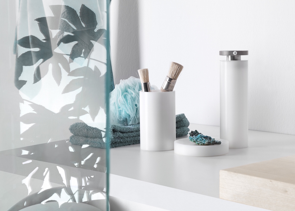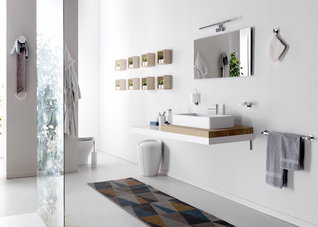 All’acciaio inox, nei vari accessori (tra i quali barre portasciugamani di varie dimensioni, dispenser, portascopino, portasapone, bicchiere) si abbina efficacemente il vetro bianco opaco.
