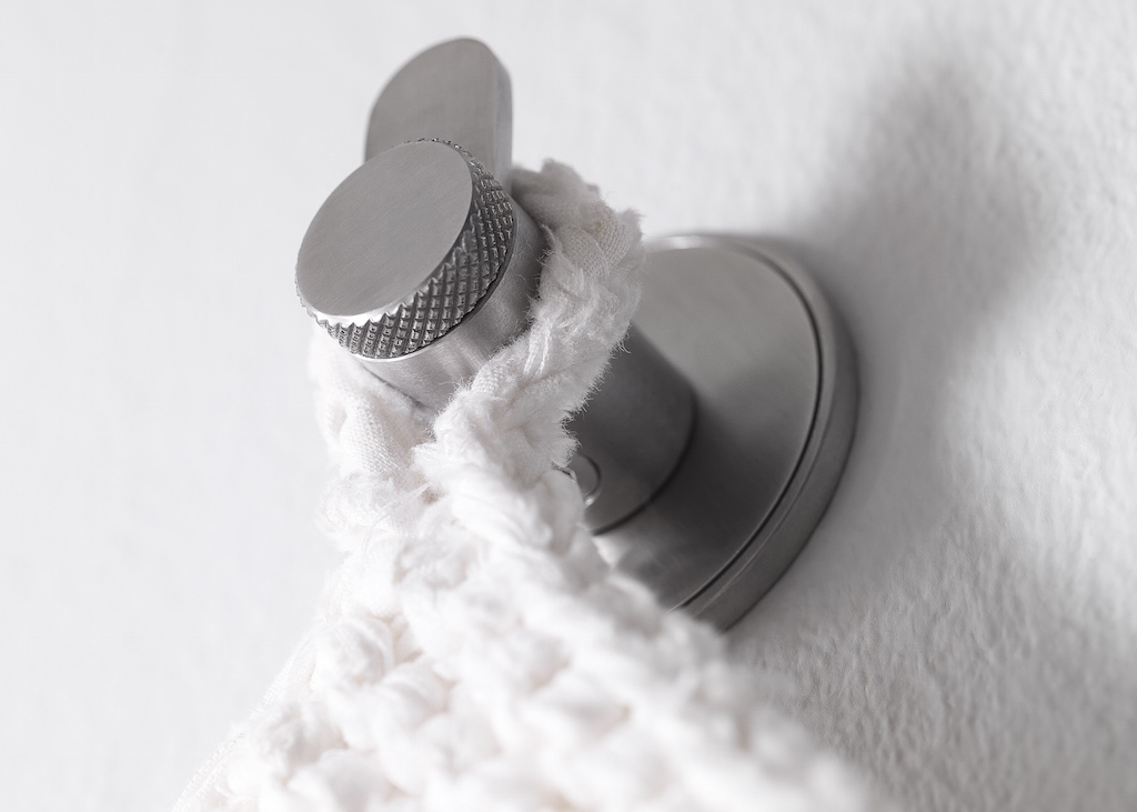 Le figure geometriche ricorrenti nel sistema, realizzato in acciaio inox satinato, sono il cerchio e il cilindro, che in alcuni dettagli (come nell’appendiaccappatoio semplice e basico) sono sottolineati dalle zigrinature tipiche di elementi tecnici come dadi e bulloni, soluzione che dona alla collezione un sapore industriale di singolare effetto.