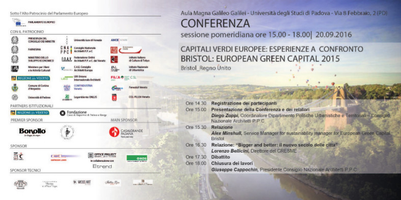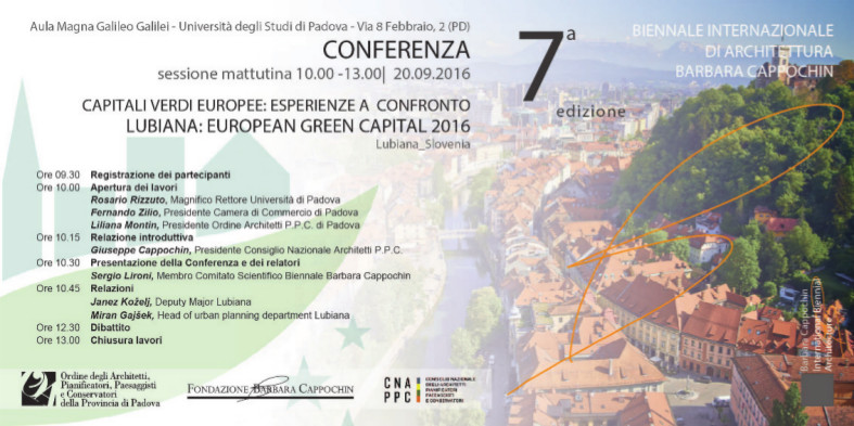 Si conclude domani, martedì 20 settembre, il ciclo di conferenze internazionali che la Biennale internazionale di Architettura “Barbara Capocchin” e l’Ordine degli architetti ppc di Padova hanno dedicato alle “Capitali verdi europee”. A partire dalle 9,30, nell’aula magna Galileo Galilei dell’Università degli Studi di Padova, si parlerà dei modelli virtuosi di Lubiana e Bristol, rispettivamente Capitale verde europea del 2016 e del 2015.