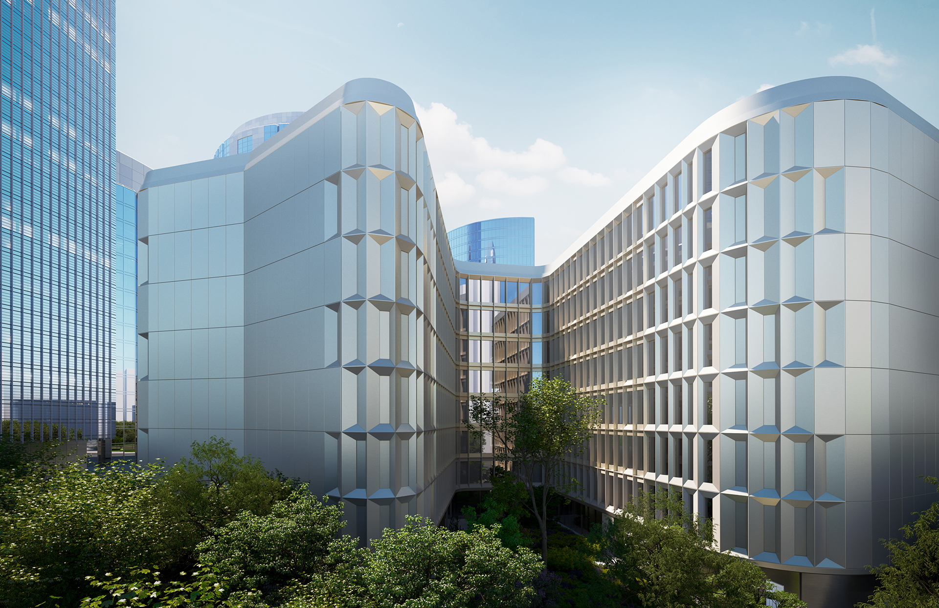 Il progetto prevede 12.500 metri quadrati di spazi a funzioni miste, tra cui uffici, un ristorante e una caffetteria. Il piano terra è trasparente e aperto al pubblico, promuovendo la miscelazione di diverse comunità, mentre la parte superiore dell’edificio dispone di un giardino pensile. Un edificio pensato quindi per creare un “terreno comune” che si estende su diversi livelli creando connessioni visive con le aree circostanti.