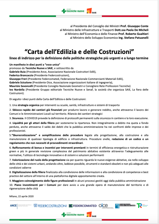 Un manifesto in 10 punti a “voce unica”, promosso da Tecniche Nuove e Saie, e sottoscritto da Gabriele Buia -Presidente Ance, Associazione Nazionale Costruttori Edili-, Federica Brancaccio -Presidente Federcostruzioni-, Giuseppe Freri -Presidente Federcomated, Federazione Nazionale Commercianti Materiali Edili-, Gabriele Scicolone -Presidente Oice, Associazione organizzazioni italiane di ingegneria-, Maurizio Savoncelli -Presidente Consiglio Nazionale Geometri e Consigliere Rete Professioni Tecniche- e Ivo Nardella -Presidente Gruppo editoriale Tecniche Nuove e Senaf, la società che organizza Saie.