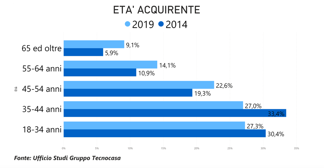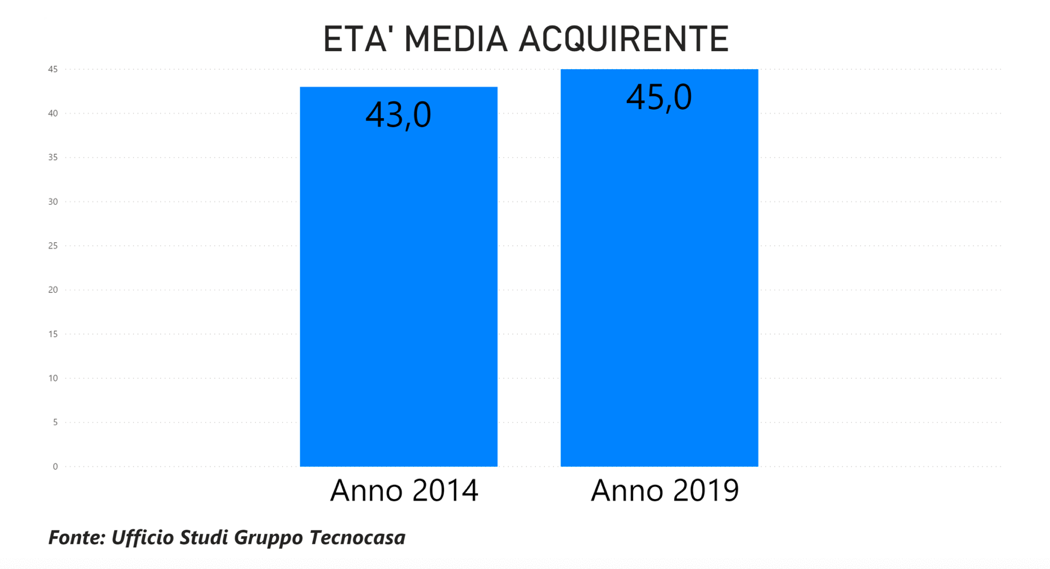 Dalle analisi condotte dall’Ufficio Studi del Gruppo Tecnocasa, su un campione delle compravendite effettuate attraverso le agenzie affiliate Tecnocasa e Tecnorete in Italia tra il 2014 ed il 2019, emerge l’età media di chi acquista un’abitazione è cresciuta portandosi da 43 a 45 anni. Aumenta, infatti, la percentuale di chi compra nelle fasce di età superiori a 45 anni.