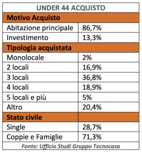 Il 71,3% degli acquirenti sono famiglie, il 28,7% sono single. Tra i single under 44 il trilocale raccoglie il 39,4% delle preferenze e a ruota il bilocale con il 33,5%.