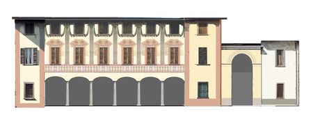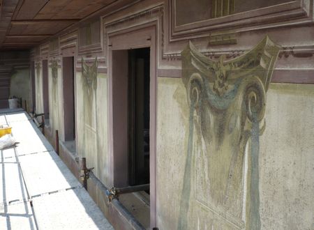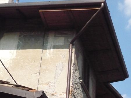La superficie d’intonaco presentava notevoli zone di distacco avanzato completo e parziale, nonché zone con le tipiche “bollature” che precedono il distacco vero e proprio. Il film pittorico era per lo più in avanzato stato di dilavamento e scolorimento; si intravvedevano in alcuni casi gli elementi pittorici di decorazione che suppliscono alla funzione decorativa di un vero e proprio modellato architettonico caratteristico delle architetture maggiori del periodo. Ampie superfici di facciata mostravano il paramento murario per lo più costituito da mattoni rossi concentrati nelle parti “speciali” (spalle e piedritti, archi o piattabande di scarico), paramento messo a nudo dal lungo periodo di assenza di interventi manutentivi o riparatori.