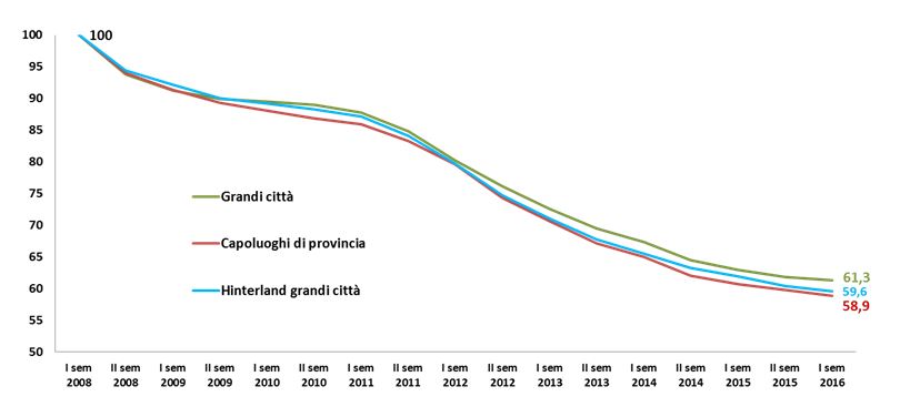 Dal 2008 il trend dei prezzi è stato sempre negativo, nelle grandi città, nell’hinterland delle grandi città e nei capoluoghi di provincia: nelle prime il valore degli immobili è diminuito del 38,7%, nell’hinterland delle stesse del 40,4% e nei capoluoghi di provincia del 41,1%.