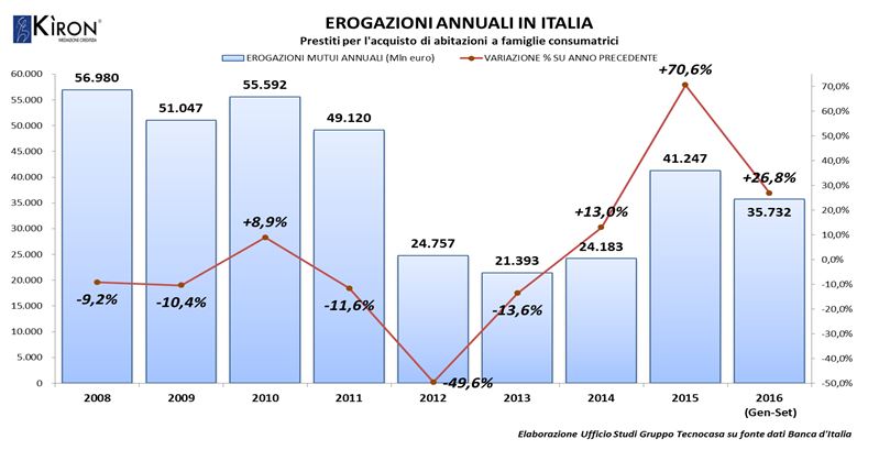 Sul fronte mutui, Le famiglie italiane hanno ricevuto finanziamenti per l’acquisto dell’abitazione per 35.732 milioni di euro nei primi nove mesi del 2016. Rispetto allo stesso periodo dell’anno scorso si registra un aumento delle erogazioni pari a +26,8% e i volumi hanno quasi raggiunto il totale erogato in tutto il 2015. È quanto emerge dai dati riportati nel Bollettino Statistico IV-2016 pubblicato da Banca d’Italia nel mese di Gennaio 2017.