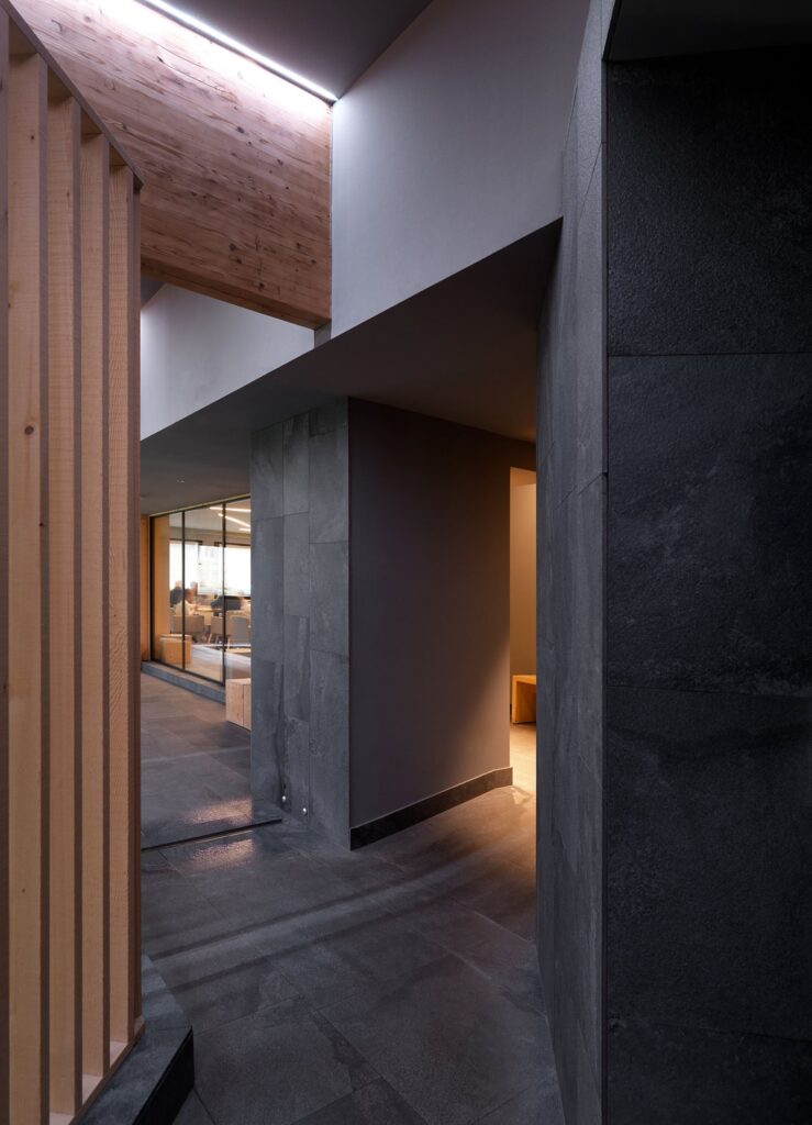Il progetto interpreta il paesaggio alpino circostante attraverso un approccio minimalista che privilegia due soli materiali a basso impatto ambientale: legno e gres porcellanato.