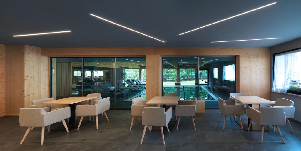 Dal punto di accoglienza, vetrate a tutta altezza permettono di attraversare visivamente la sala TV e il centro benessere fino al giardino esterno.