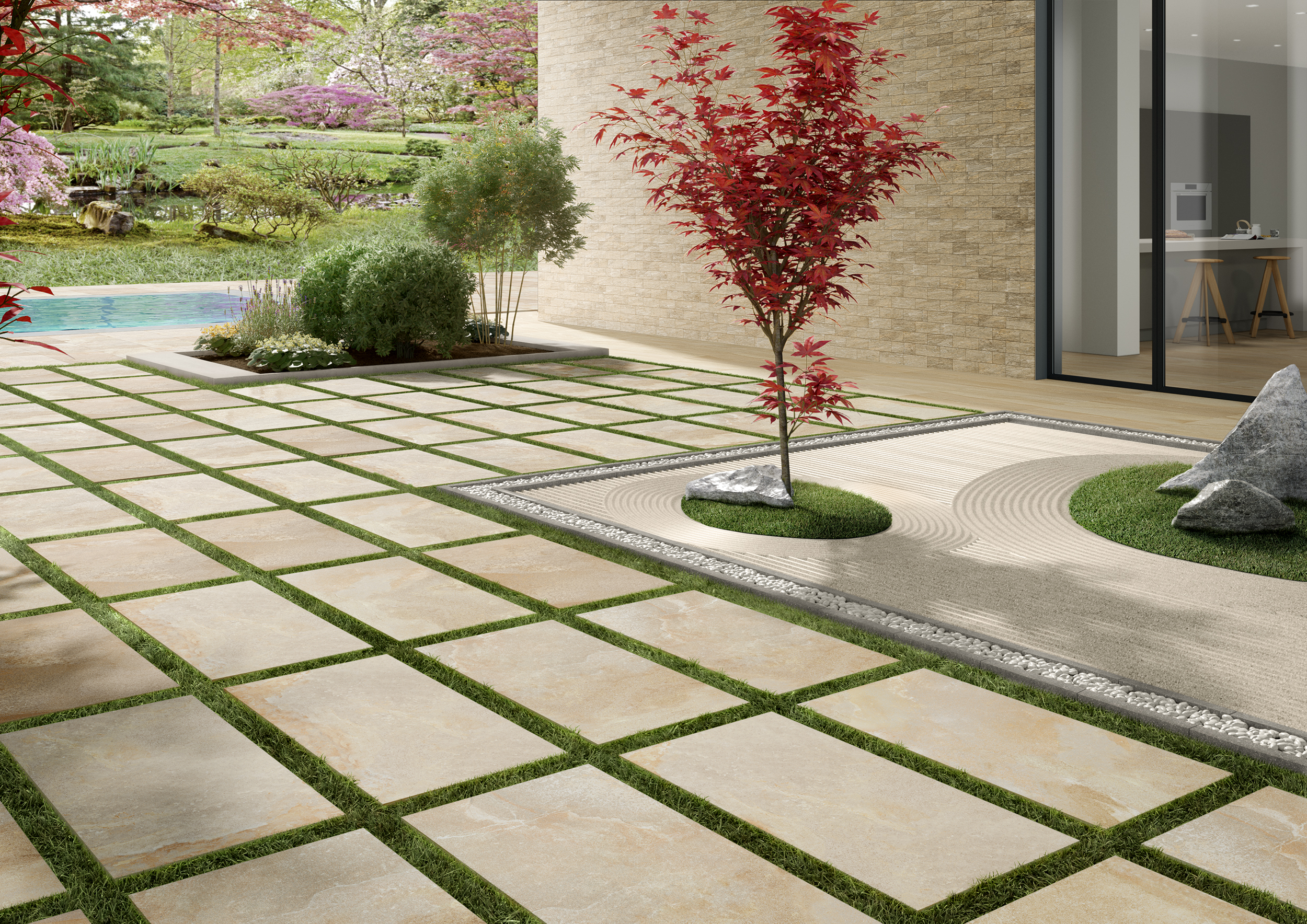 Le lastre in gres porcellanato per esterno possono essere posate a colla su masse o garantendo al pavimento una elevata resistenza ai carichi oppure dire direttamente su ghiaia, sabbia o fondo erboso, consentendo di ottenere un pavimento immediatamente calpestabile senza la necessità di un masse o e senza l’uso di malte e colle.